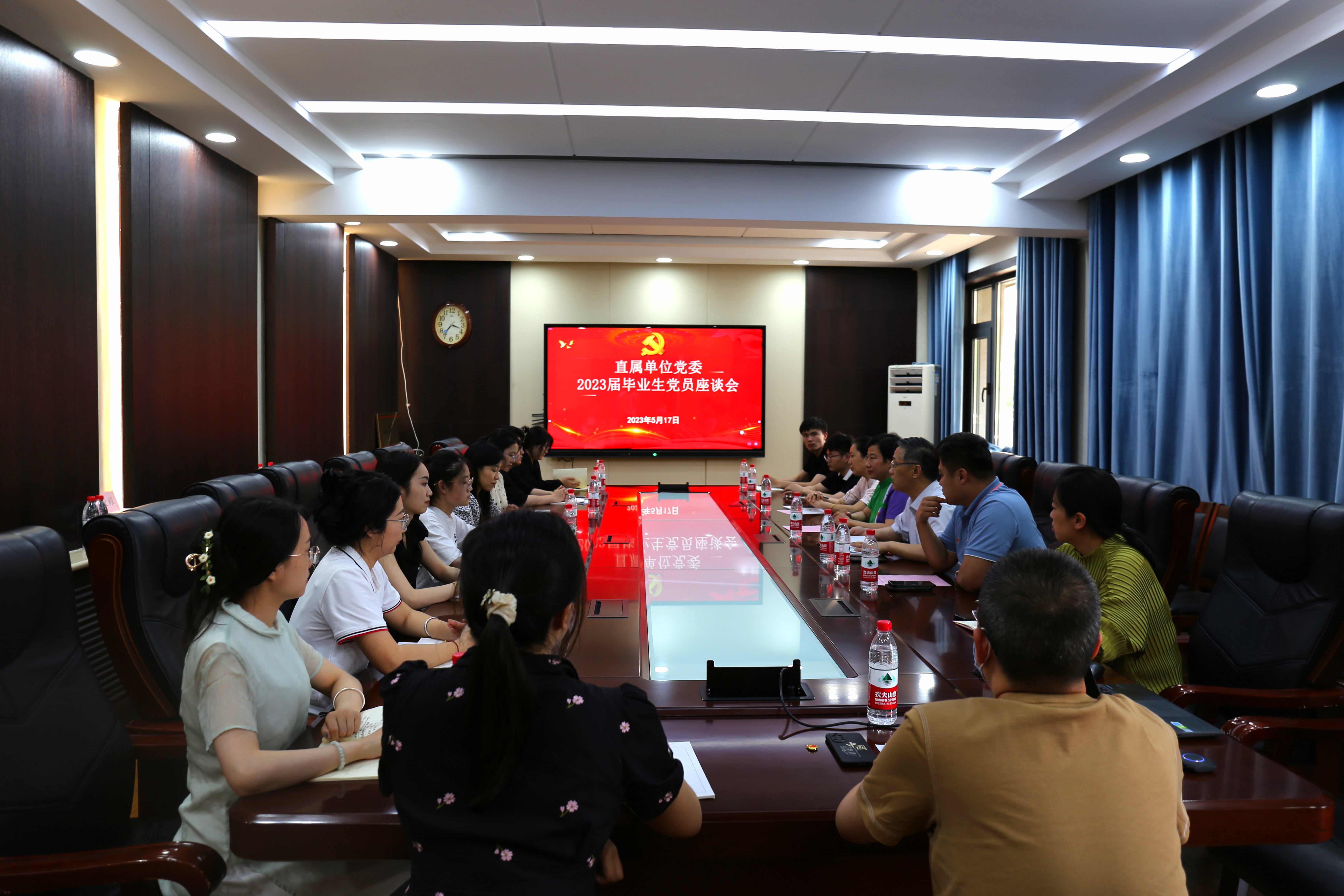 为深入开展学习贯彻习近平新时代中国特色社会主义思想主题教育,进一步加强毕业生党员教育做好2023届毕业生党员离校教育管理工作,5月17日下午,山东师范大学直属单位党委在千佛山校区逸夫楼211会议室举行毕业生党员座谈会。直属单位党委书记胡桂香直属单位党委综合科科长韩雨宏、齐鲁文化研究院研究生辅导员李莉、图书馆研究生辅导员蒋宗凯和毕业生党员、非毕业生党员代表参与本次座谈会。会议由直属单位党委副书记、齐鲁文化研究院副院长颜春杰主持。