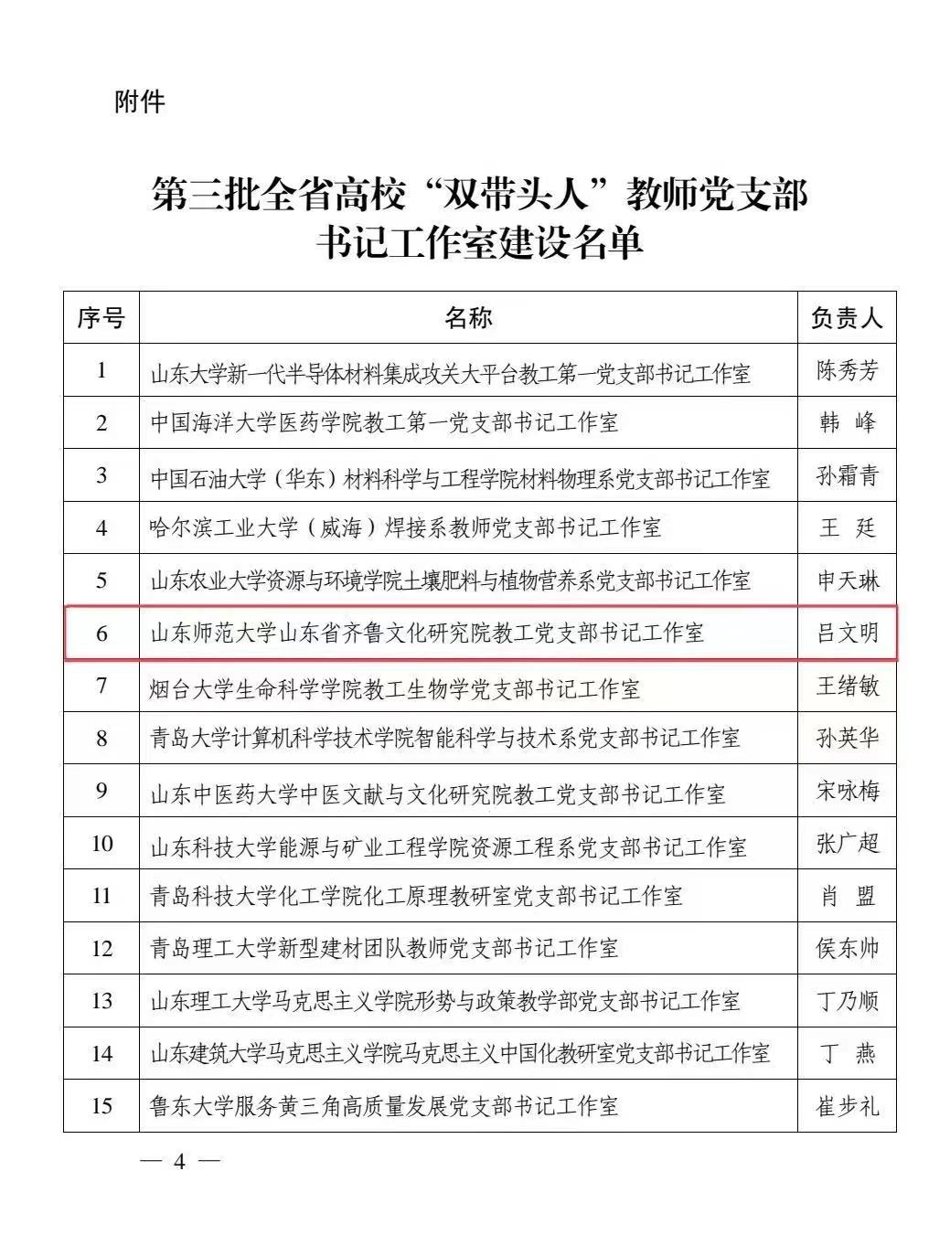 近日,中共山东省委教育工委公布了第三批全省高校“双带头人”教师党支部书记工作室评选结果,遴选产生了50个全省高校“双带头人”教师党支部书记工作室,以齐鲁文化研究院院长、博士生导师吕文明教授为带头人的山东师范大学山东省齐鲁文化研究院教工党支部书记工作室成功入选。