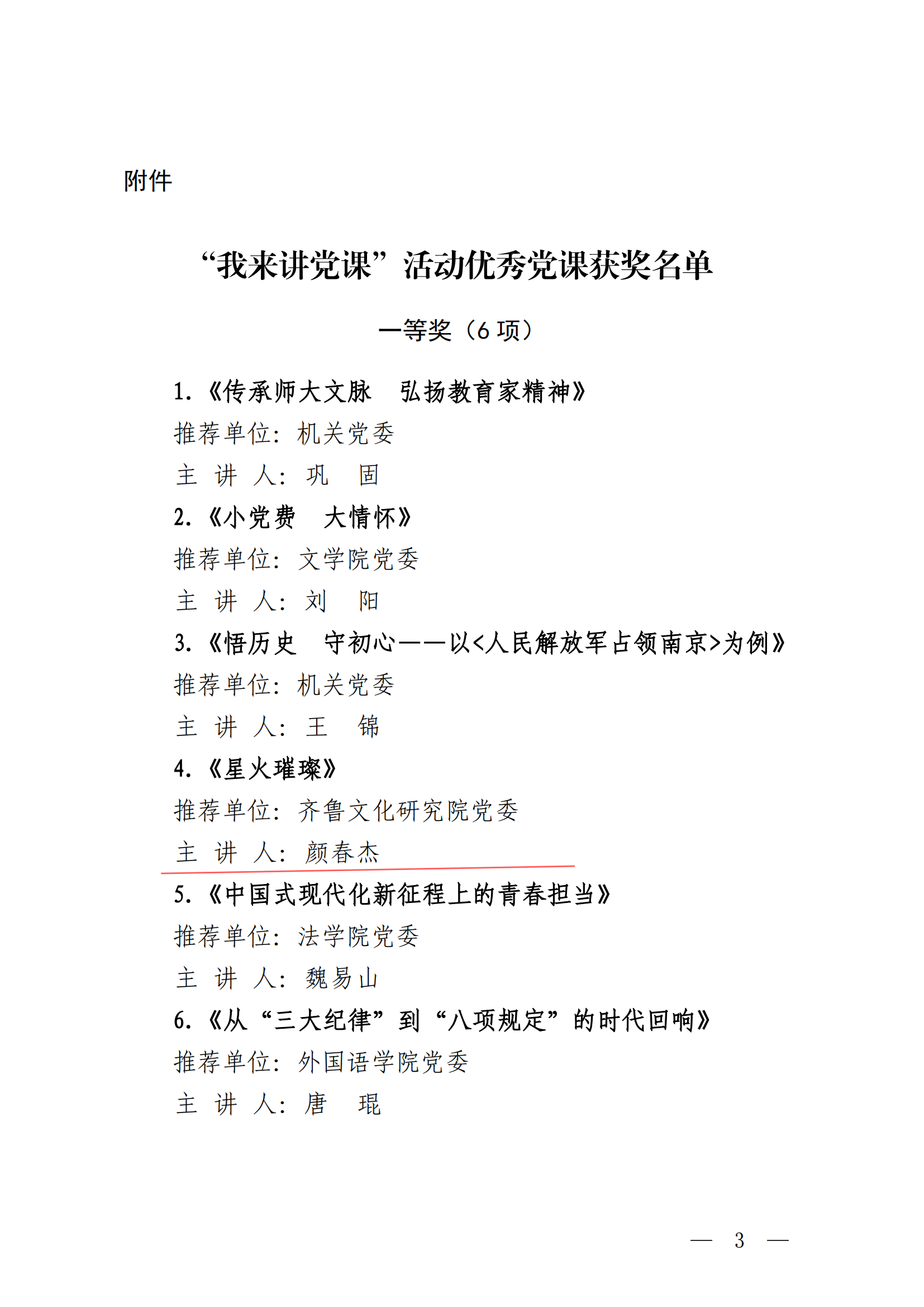 近日,学校组织部公布了“党课开讲啦”活动的优秀作品表彰名单。齐鲁文化研究院党委书记颜春杰主讲的党课获评一等奖。