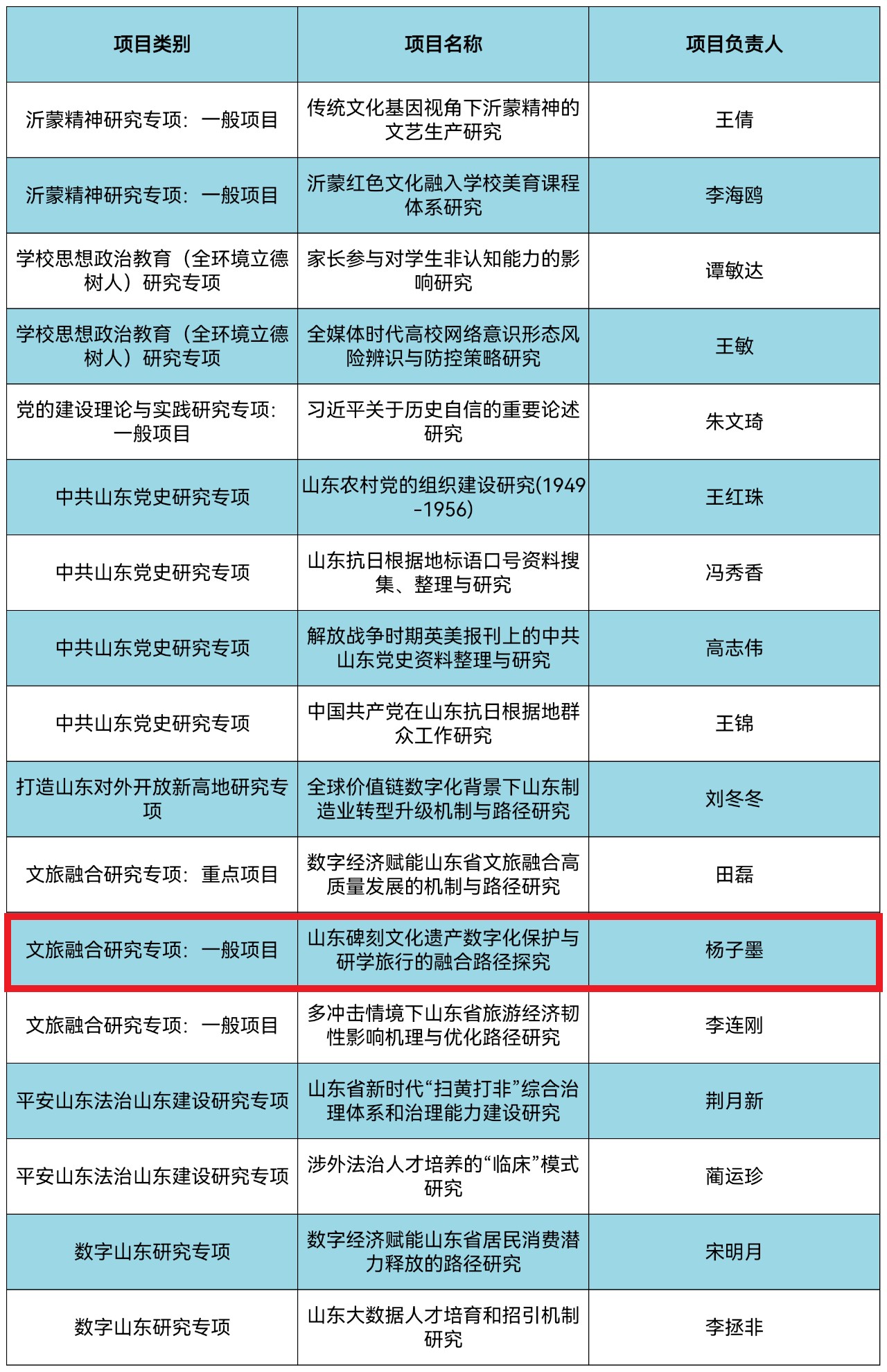 近日,山东省哲学社会科学工作办公室公布了2022年度山东省社科规划研究专项项目的立项结果。我院青年教师杨子墨博士主持申报的“山东碑刻文化遗产数字化保护与研学旅行的融合路径探究”获准立项。