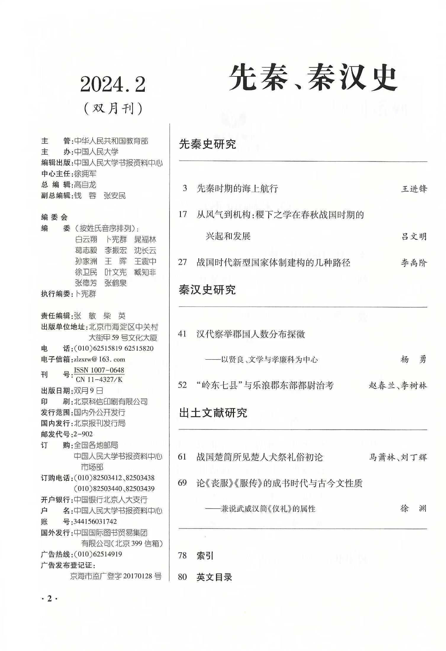 近日,《先秦、秦汉史》2024年第2期主体转载了齐鲁文化研究院院长、博士生导师吕文明教授的学术文章《从风气到机构:稷下之学在春秋战国时期的兴起和发展》。该文原发于《文史哲》2023年第6期,是教育部人文社科重点研究基地重大项目“齐鲁文化传承发展与汉魏六朝政治文化格局研究”(项目编号:22JJD770052)、山东省社会科学规划重大项目“山东人文沃土可以深度耕作研究——文化‘两创’的比较优势研究”(项目编号:23AWTJ05)和泰山学者工程专项经费资助课题(项目编号:tsqn201812037)的阶段性成果。