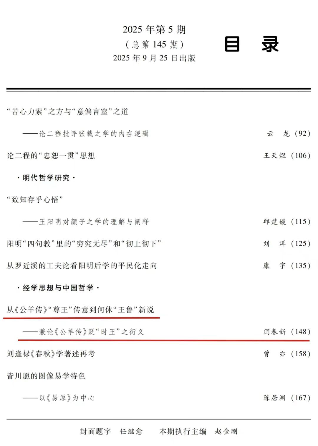 近日,《中国哲学史》(CSSCI)2025年第5期刊发齐鲁文化研究院博士生导师闫春新教授的学术文章《从<公羊传>“尊王”传意到何休“王鲁”新说——兼论<公羊传>贬“时王”之衍义》。本文系国家社科基金一般项目“魏晋玄学统摄下的儒道佛经典互诠研究(23BZX027)”、国家社科基金一般项目“经学观念视野下的汉唐《春秋》学研究”(16BZX055)、泰山学者工程专项经费资助课题(tstp20240508)等的阶段性成果。