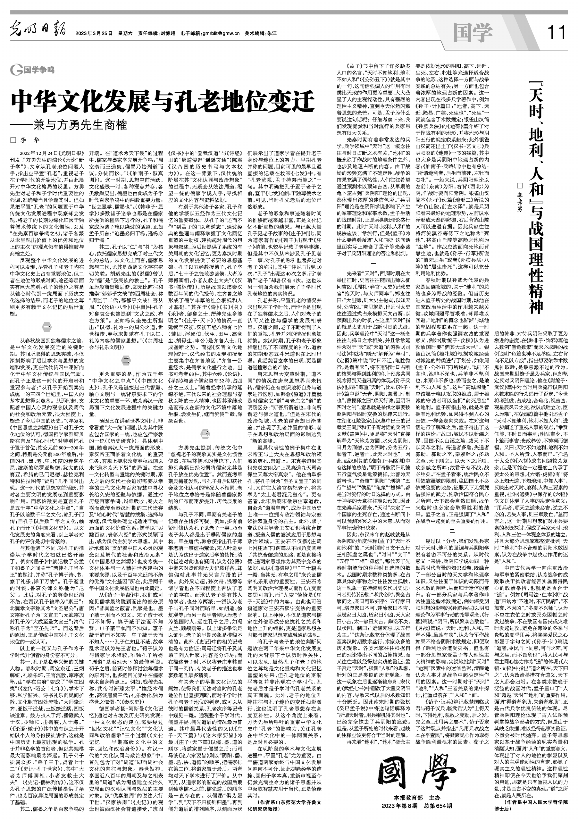 3月25日,《光明日报·国学版》刊发了山东师范大学齐鲁文化研究院李华教授的理论文章《中华文化发展与孔老地位变迁》,文章对方勇先生“先秦时期各家平等并存”的观点进行了质疑,指出孔子的地位之尊是从轴心时代到一统局面下历次文化选择的结果,而老子的地位之尊则更多有赖于文化记忆的后世重塑。文章认为,在现阶段的学术与文化发展进程中,平置“孔老”尤为重要。由于儒道两家始终与中国文化发展问题密不可分,因此摒除经学的遮掩、回归子学本真,重新审视至今仍然充满生命力的诸子思想并从中汲取智慧应用于当代,正是恰逢其时。