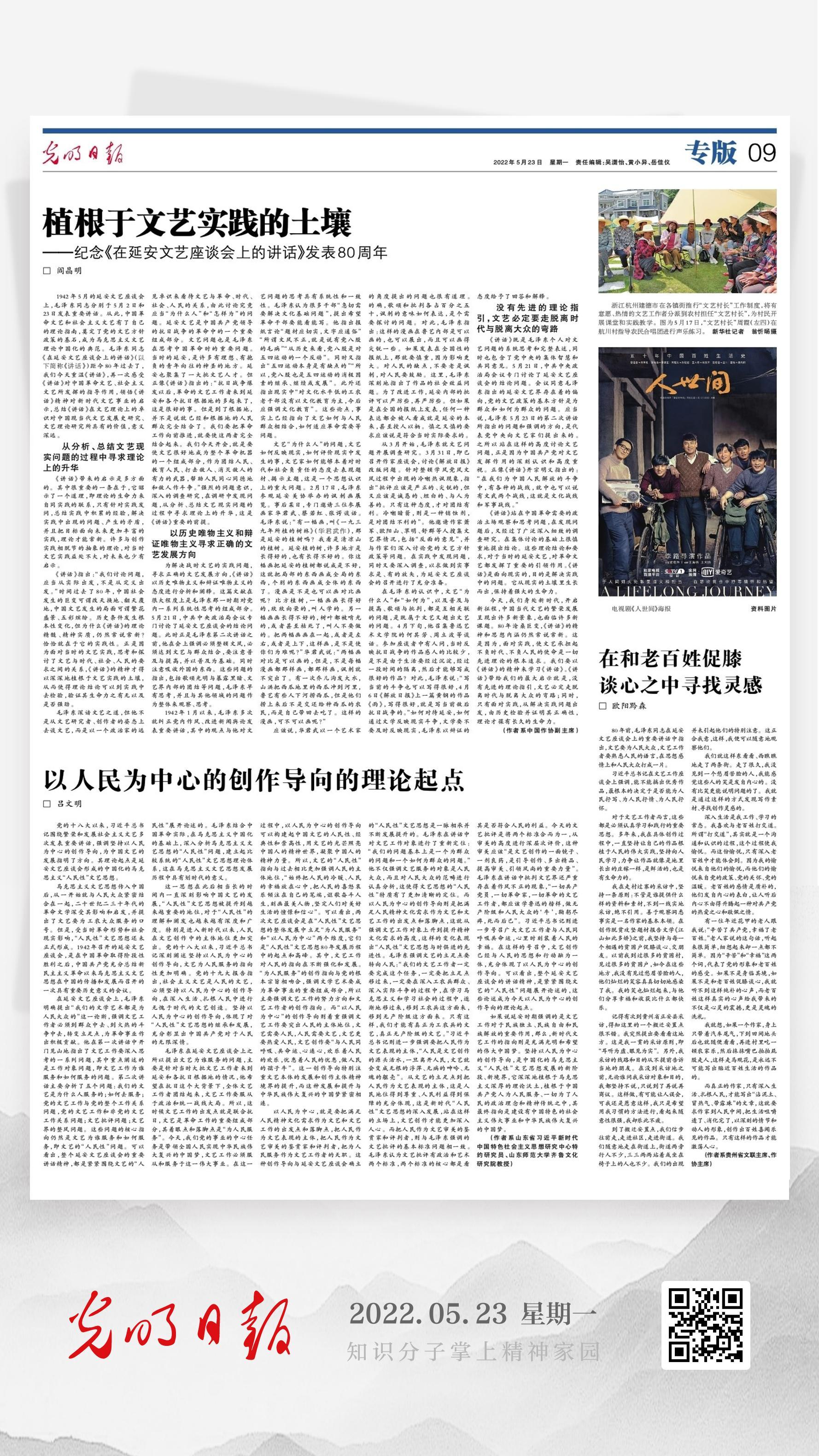 5月23日,《光明日报》第9版刊发了齐鲁文化研究院副院长、博士生导师吕文明教授的理论文章《以人民为中心的创作导向的理论起点》。文章认为,党的十八大以来,习近平总书记围绕繁荣和发展社会主义文艺多次发表重要讲话,强调坚持以人民为中心的创作导向,为中国文艺的发展指明了方向。其理论起点是延安文艺座谈会形成的中国化的马克思主义“人民性”文艺思想。