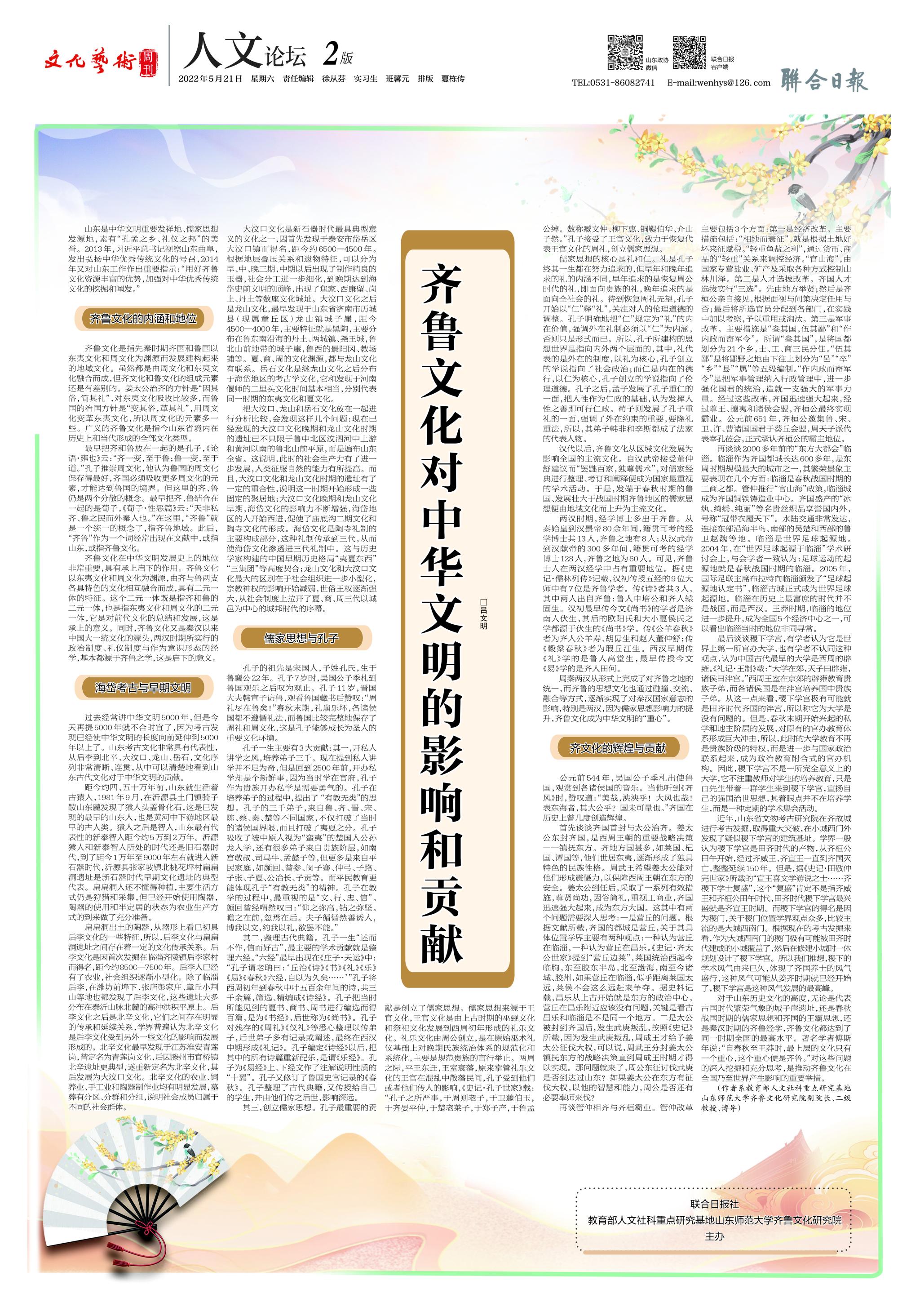 5月21日,“人文论坛”第三期刊发了齐鲁文化研究院副院长、博士生导师吕文明教授的理论文章《齐鲁文化对中华文明的影响和贡献》。文章认为,对于山东历史文化的高度,无论是代表古国时代繁荣气象的城子崖遗址,还是春秋战国时期的儒家思想和齐国的王霸思想,还是秦汉时期的齐鲁经学,齐鲁文化都达到了同一时期全国的最高水平。