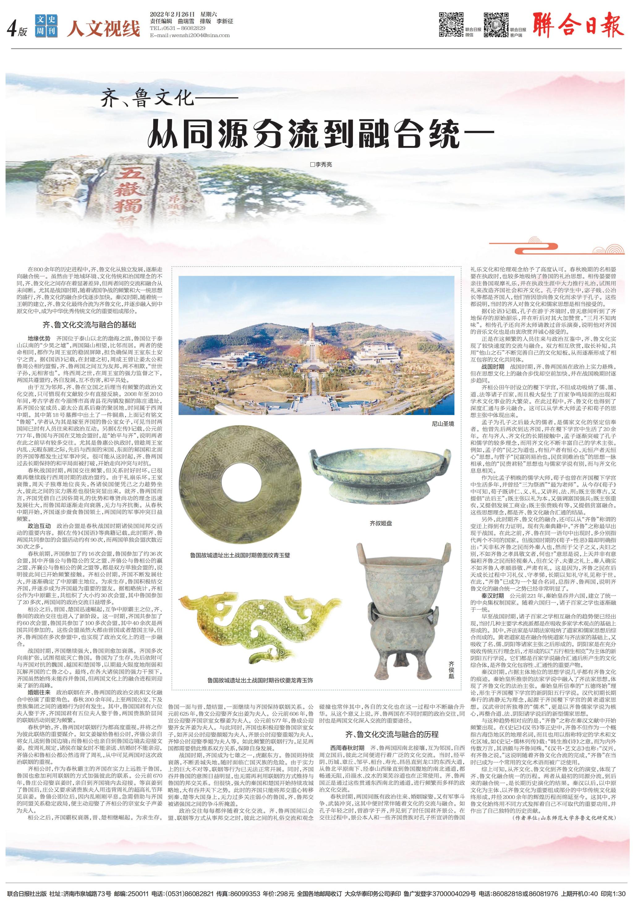 2月26日,《联合日报》整版刊发了研究院李秀亮博士的学术文章《齐、鲁文化:从同源分流到融合统一》,文章梳理了齐、鲁文化同源、分流、融合、统一的详细发展历程,揭示了齐鲁文化的内涵演变与创新发展。