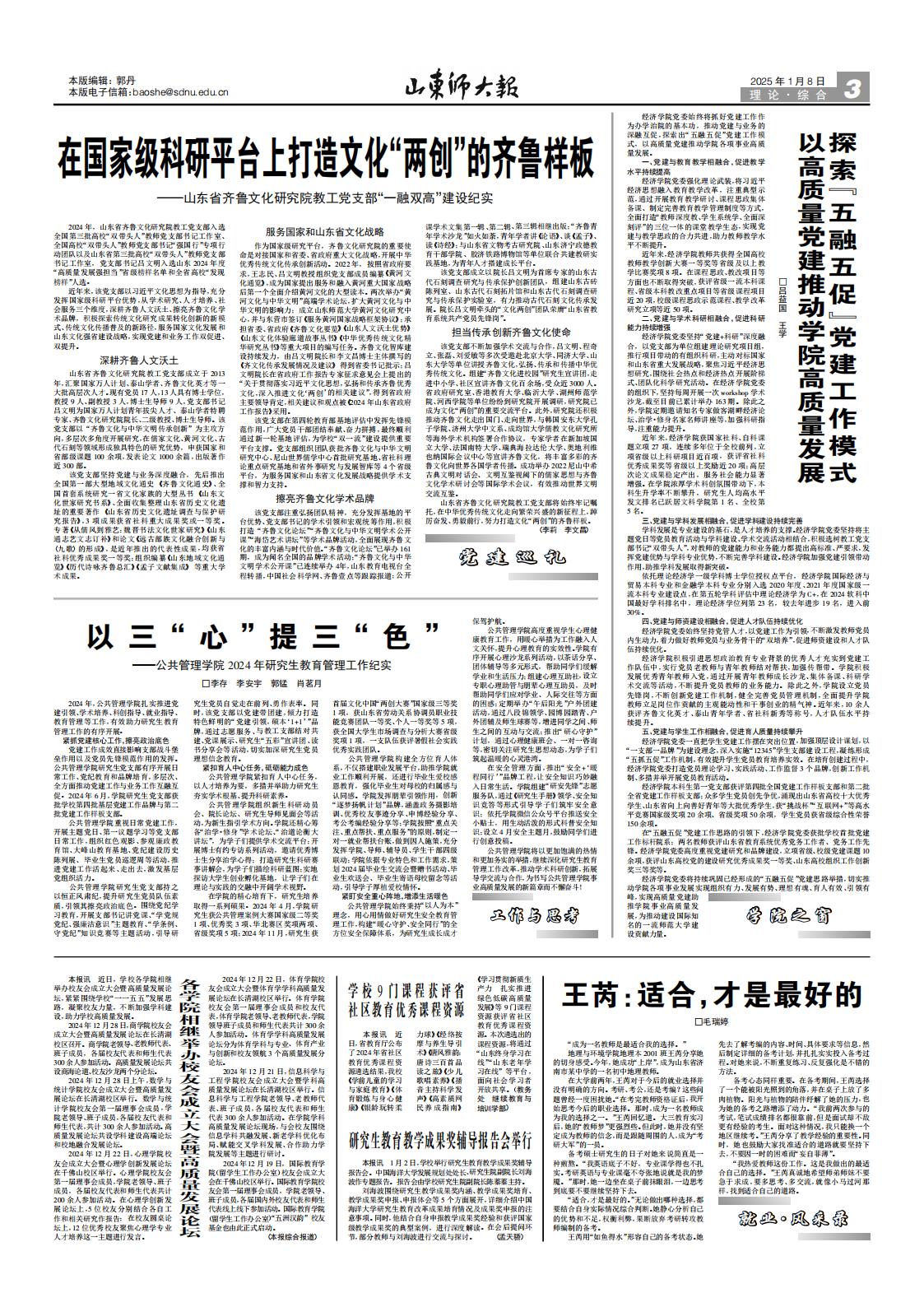 2025年1月8日,《山东师大报》刊发了《在国家级科研平台上打造文化“两创”的齐鲁样板——山东省齐鲁文化研究院教工党支部“一融双高”建设纪实》一文。