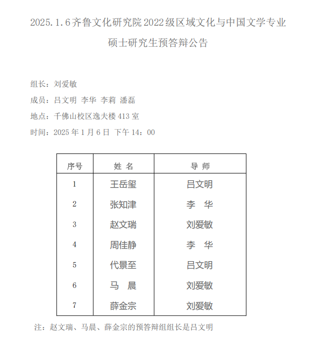 2025.1.7齐鲁文化研究院2022级中国史专业硕士研究生预答辩公告