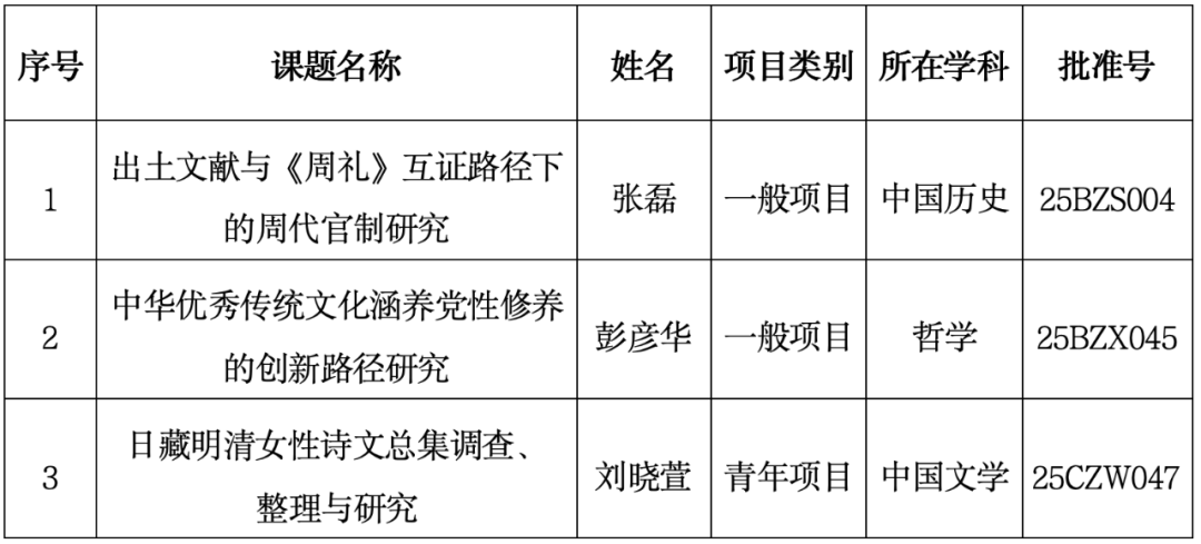 近日,全国哲学社会科学规划办公室公布了2025年度国家社科基金一般项目和青年项目的立项结果。我院共有3项课题立项,其中2项一般项目、1项青年项目,分别是张磊教授的“出土文献与《周礼》互证路径下的周代官制研究”、彭彦华教授的“中华优秀传统文化涵养党性修养的创新路径研究”和刘晓萱老师的“日藏明清女性诗文总集调查、整理与研究”。