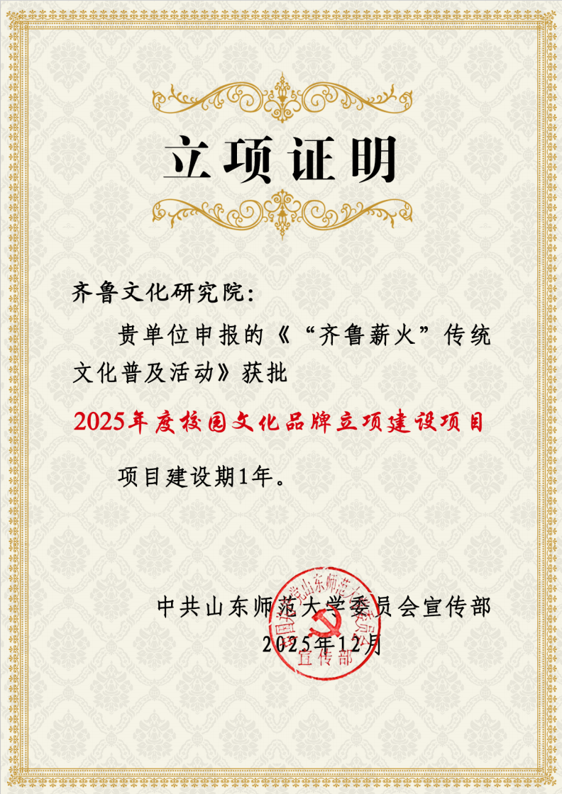 近日,山东师范大学党委宣传部公布了2025年度校园文化品牌立项名单。我院申报的“‘齐鲁薪火’传统文化普及活动”成功入选。