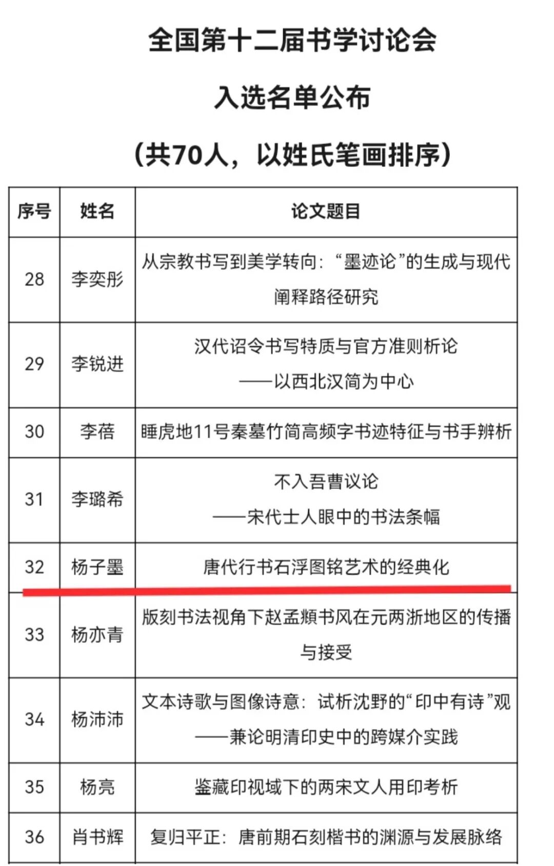 近日,由中国书法家协会主办的第十二届全国书学讨论会评审结果正式公布。本次讨论会作为中国书法界最高规格的学术活动,以推动新时代书法艺术的创造性转化与创新性发展为宗旨,共收到来自全国的学术稿件1696篇。经过严格的初评、复评、查重审核、终评及答辩考核等多轮遴选,共评出拟入选论文72篇,经公示后最终公布入选论文70篇。其中,齐鲁文化研究院副教授、山东省青年书法家协会学术委员会副主任杨子墨撰写的《唐代行书石浮图铭艺术的经典化》一文成功入选,展示了齐鲁学者在书法理论与历史研究领域的深厚积累与前沿视野。
