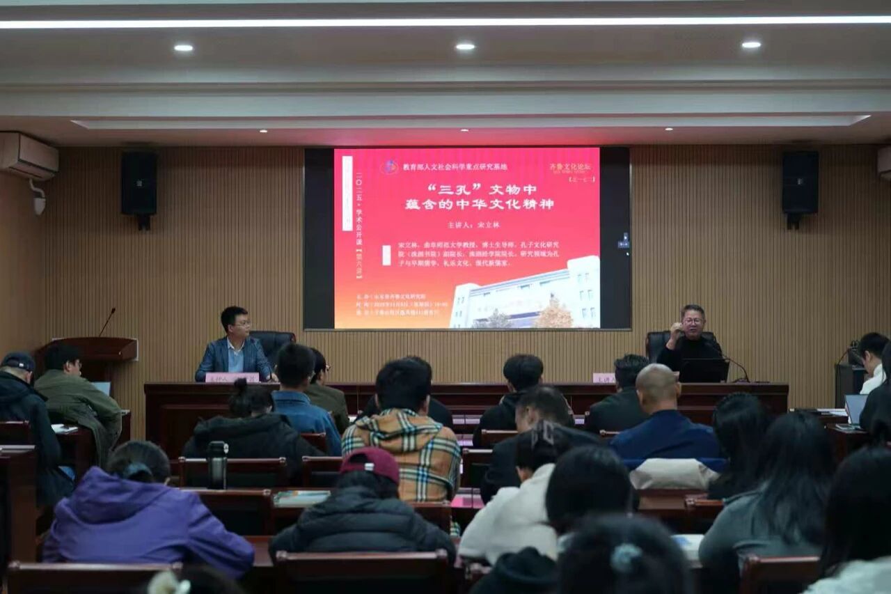 11月6日晚,由教育部人文社会科学重点研究基地山东师范大学齐鲁文化研究院主办的“齐鲁文化与中华文明”学术公开课(第五季)第六讲暨“齐鲁文化论坛”第一七二期《“三孔”文物中蕴含的中华文化精神》,在山东师范大学千佛山校区逸夫楼四楼报告厅举行。本次公开课由曲阜师范大学教授宋立林担任主讲嘉宾,齐鲁文化研究院学术副院长李文昌主持。齐鲁文化研究院师生、千佛山校区部分本科生参加了本次讲座。