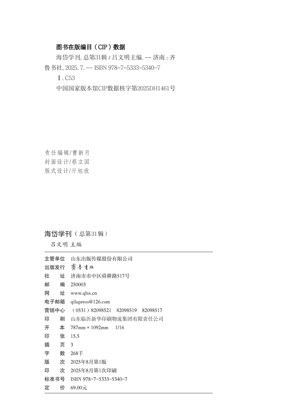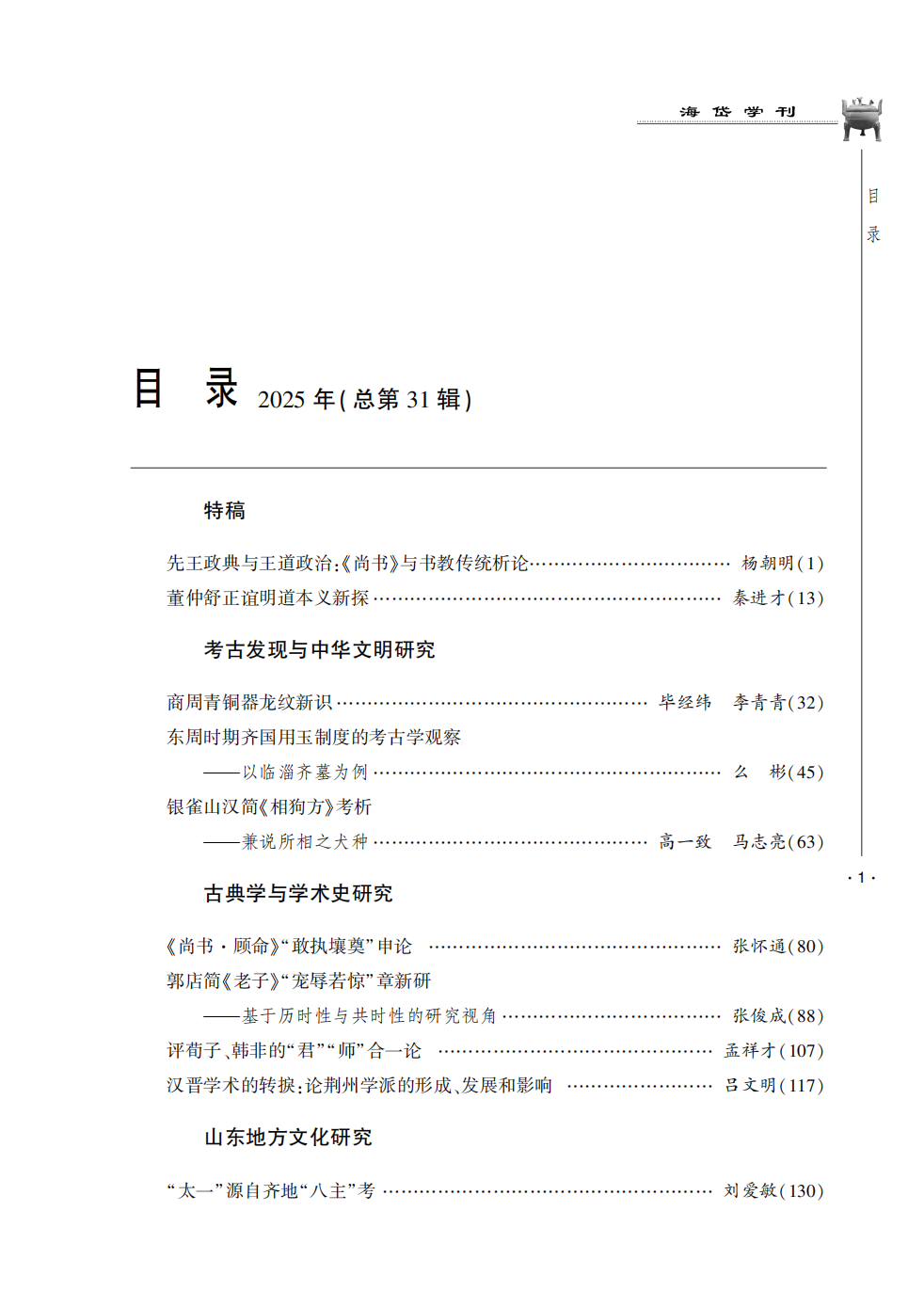 近日,教育部人文社会科学重点研究基地山东师范大学齐鲁文化研究院主办的《海岱学刊》第31辑由齐鲁书社出版发行。该辑共刊登了杨朝明、秦进才、孟祥才等学者的理论文章17篇。学者们围绕“考古发现与中华文明研究”“古典学与学术史研究”“山东地方文化研究”“文明交流互鉴研究”等专题,对相关学术问题作了深入探讨。