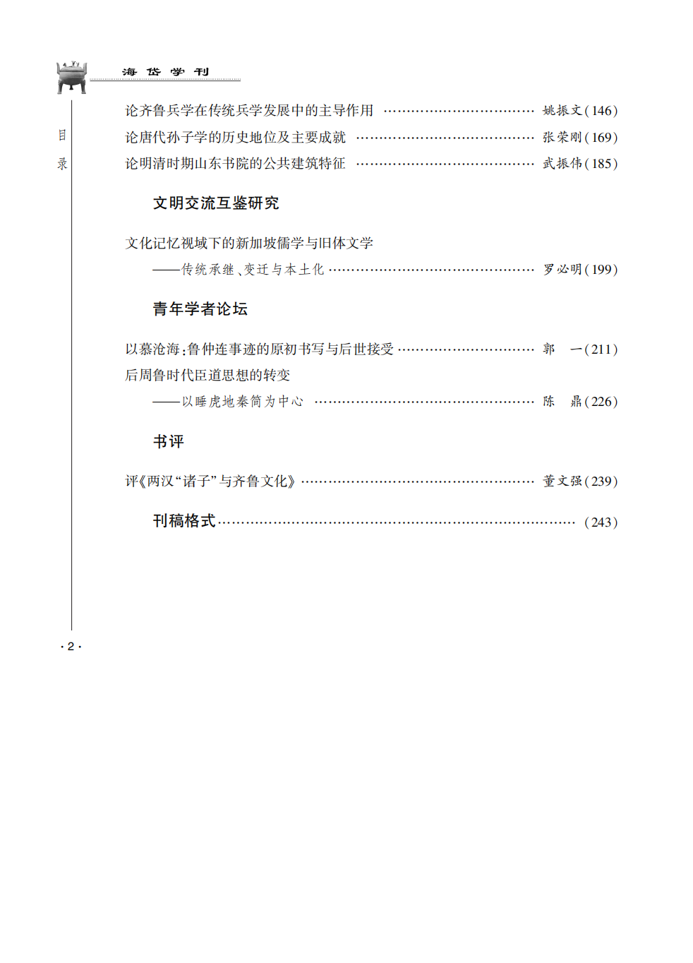河北师范大学历史文化学院教授张怀通的文章,利用畯簋等青铜器铭文考证了《尚书·顾命》的“敢执壤奠”问题。陕西师范大学历史文化学院教授毕经纬的文章,深入探讨了商周青铜器上龙纹的表现形式和文明史意义。曲阜师范大学历史文化学院教授张俊成的文章,从历时性与共时性的研究视角重新辨析了郭店简《老子》“宠辱若惊”章的有关字词和思想内涵。山东师范大学齐鲁文化研究院教授刘爱敏的文章,全面探讨了“太一”的丰富内涵和起源地域。山东航空学院孙子研究院教授姚振文的文章,详细论述了齐鲁兵学在传统兵学发展中具有主体地位和主导作用。齐文化研究院研究员武振伟的文章,全面总结了明清时期山东书院的公共建筑特征。
