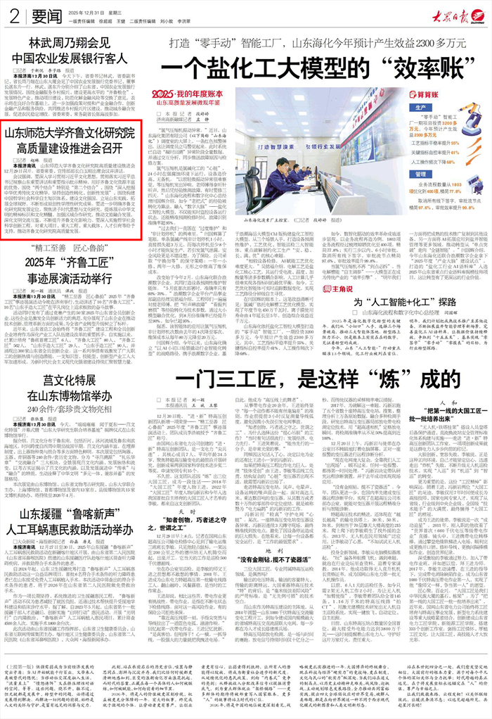 【编者按】近日,山东新闻联播、《大众日报》2版要闻专题报道山东师范大学齐鲁文化研究院高质量建设推进会召开,省委常委、宣传部部长白玉刚出席会议并讲话。会议强调,要深入学习贯彻习近平文化思想,贯彻落实习近平总书记视察山东重要讲话和重要指示批示精神,用好齐鲁文化资源丰富的优势,围绕“两个结合”特别是“第二个结合”、围绕“深入挖掘中华优秀传统文化精华,坚持创造性转化、创新性发展”、围绕构建中国哲学社会科学自主知识体系、建设文化强国,立足山东实践,拓展全球视野,不断形成原创性学理性研究成果。要进一步明确齐鲁文化研究院发展定位,聚焦诸子时代思想与文化研究,提炼展示中华文明的精神标识和文化精髓,加强区域合作研究,推动文旅融合发展,深化文明交流互鉴,不断提升齐鲁文化影响力。要深入实施哲学社会科学创新工程,对重大项目、重大工程、重大载体、人才引育等给予支持,推动齐鲁文化研究院高质量发展。具体如下: