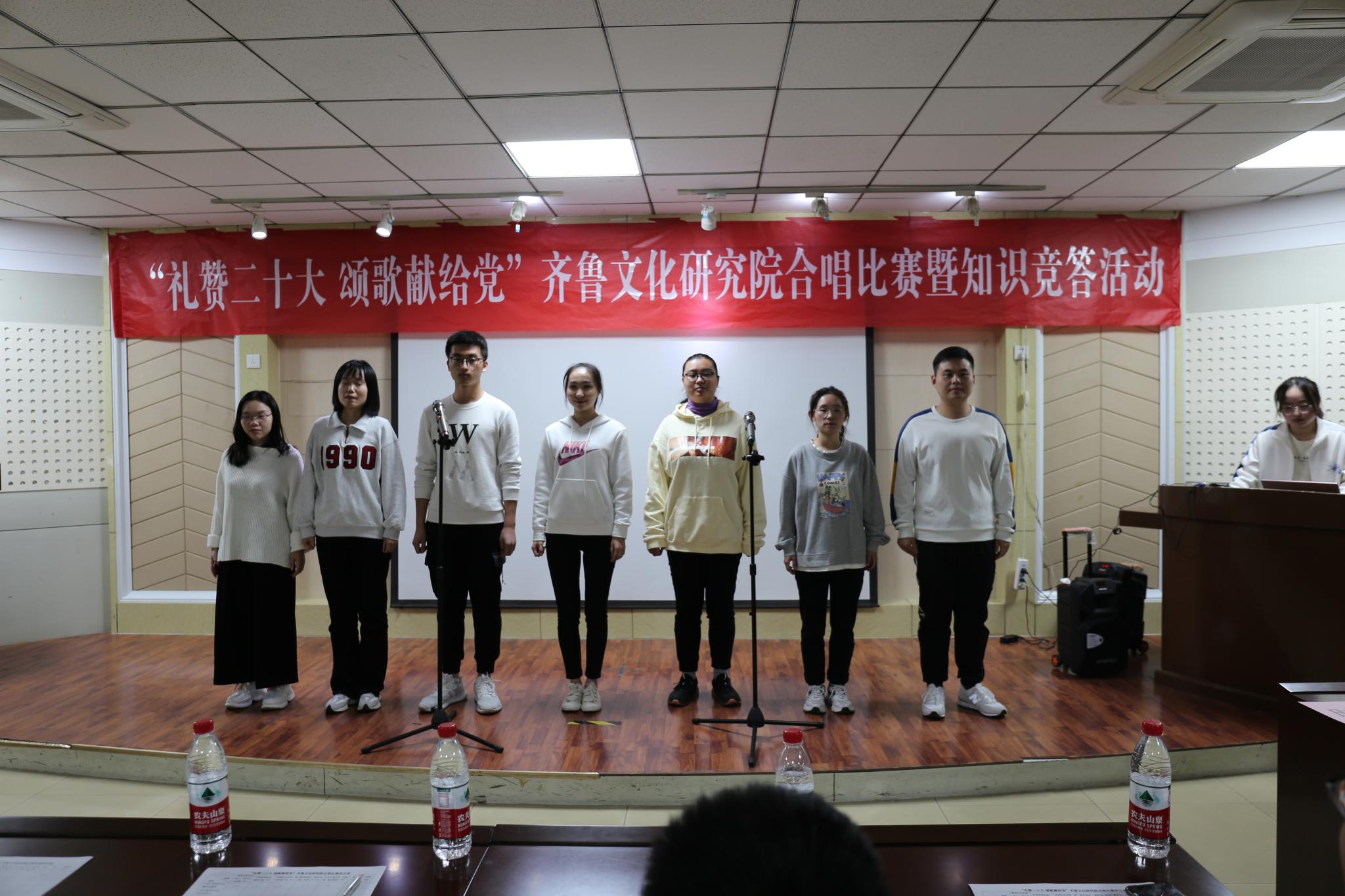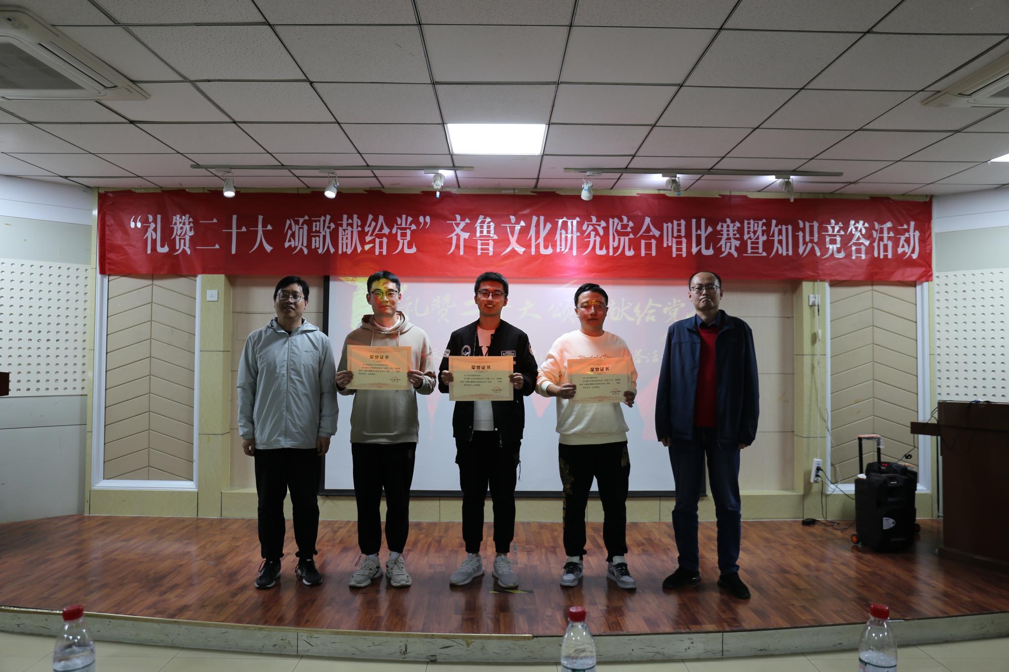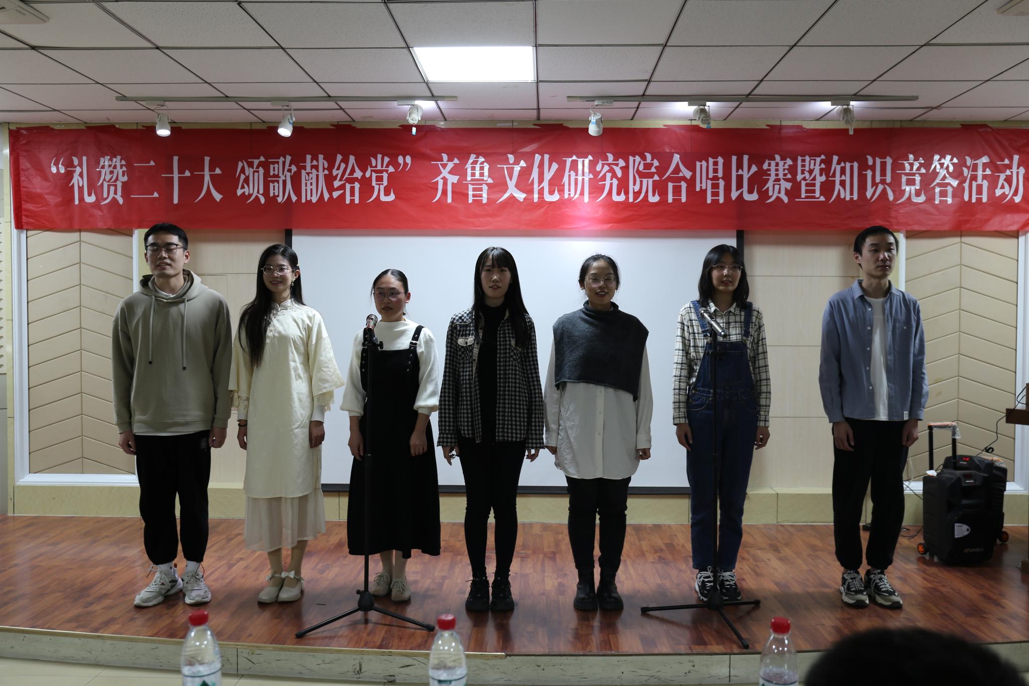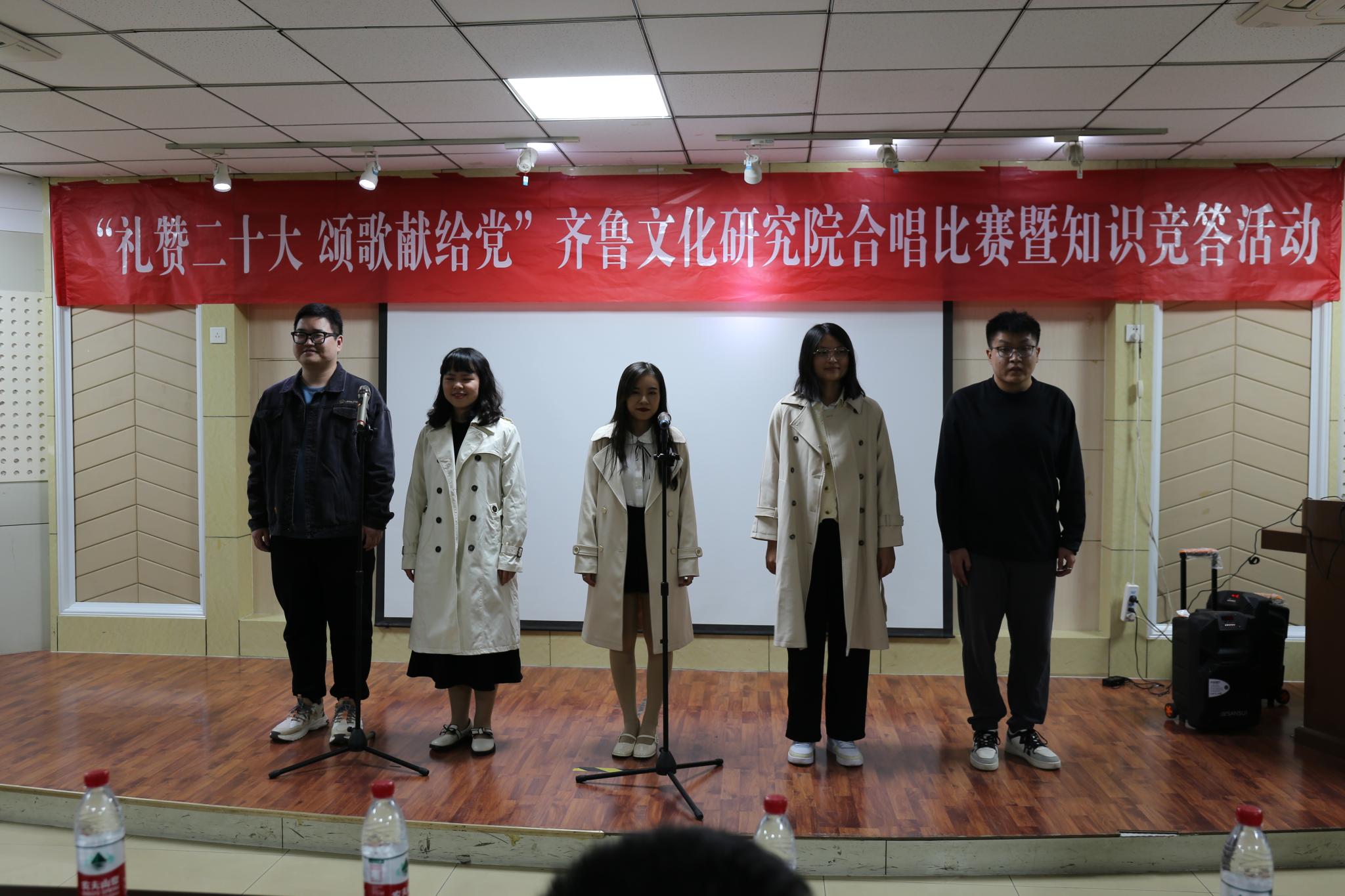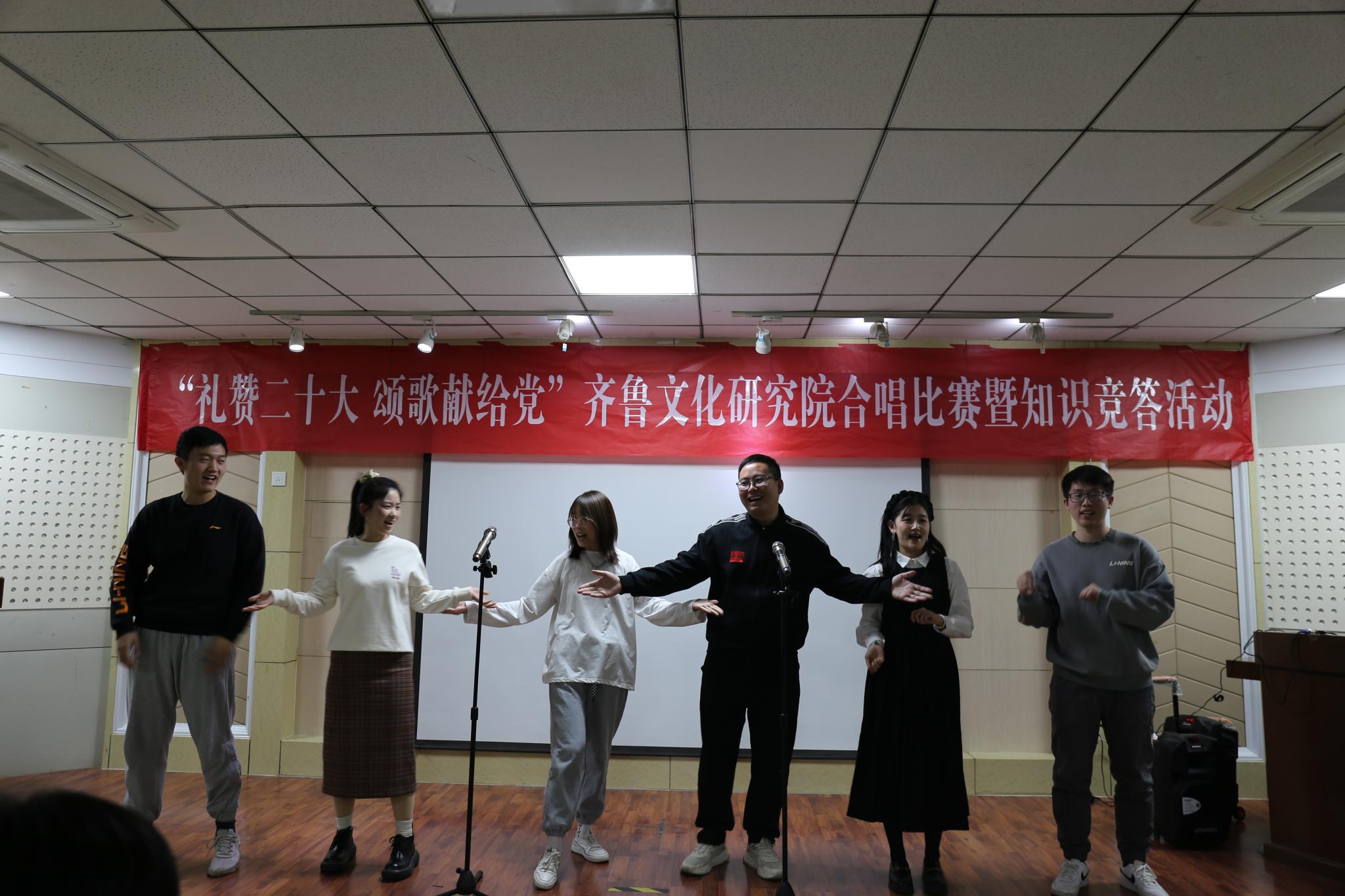 为庆祝党的二十大的胜利召开,10月19日晚,齐鲁文化研究院在千佛山校区逸夫楼106报告厅举办“礼赞二十大,颂歌献给党”合唱比赛暨知识竞答活动。直属单位党委书记胡桂香,直属单位党委副书记、齐鲁文化研究院副院长颜春杰,齐鲁文化研究院院长助理代生,研究院团委书记、学工办主任李莉,青年教师田成浩、刁春辉出席活动并担任活动评委,齐鲁文化研究院全体研究生参加了比赛。