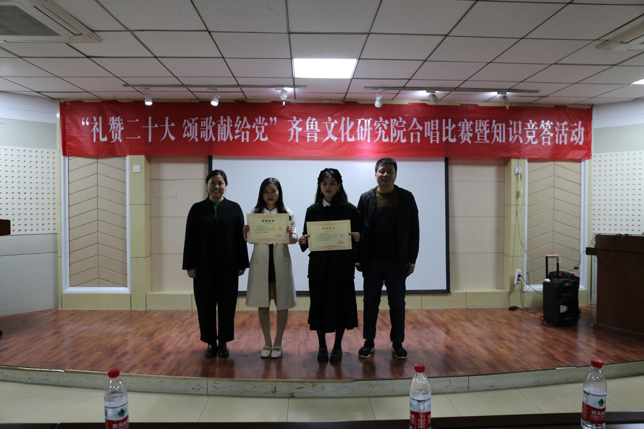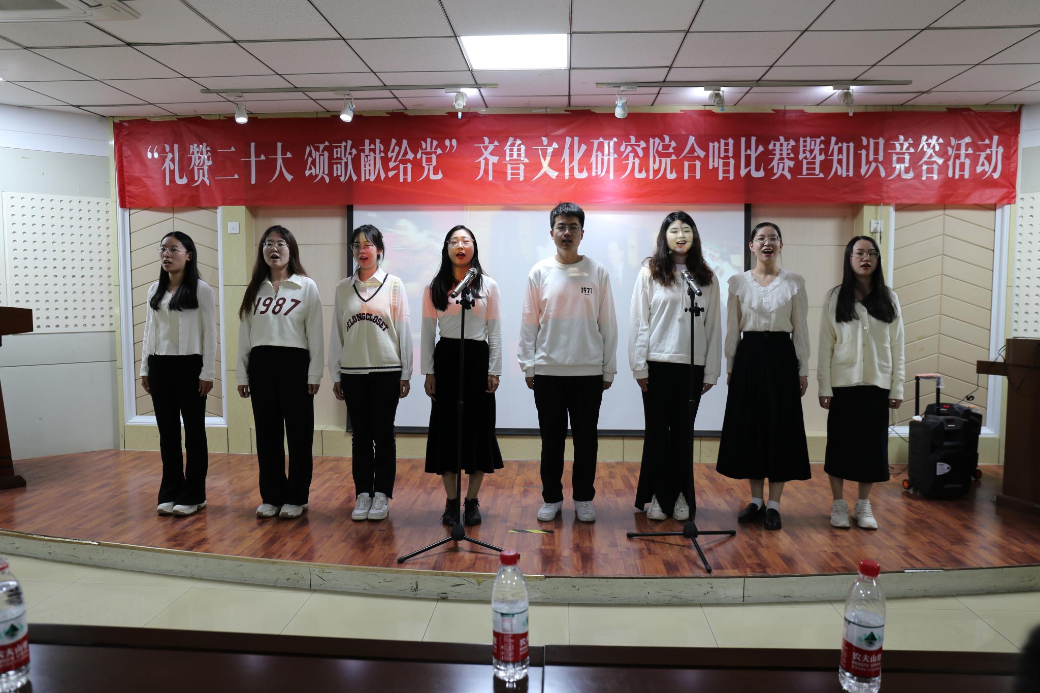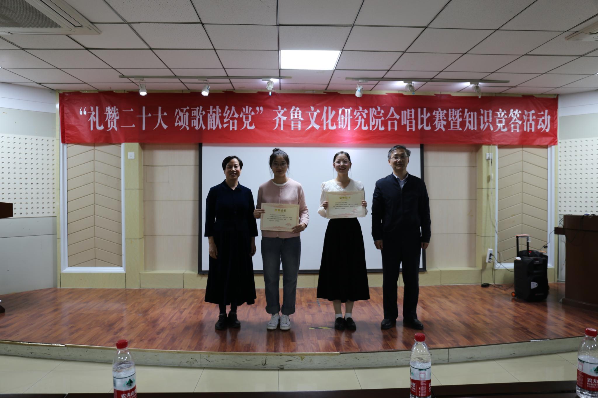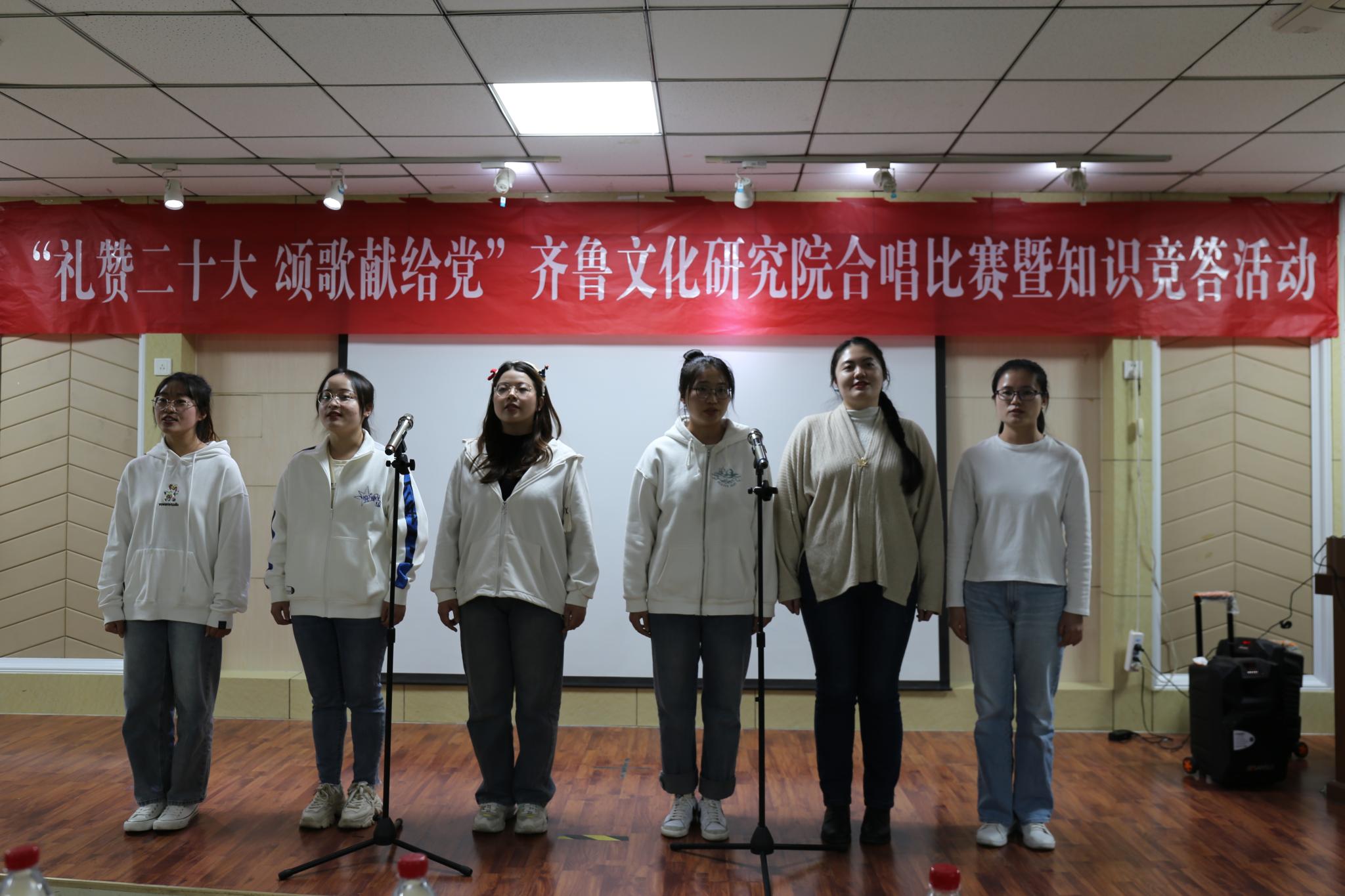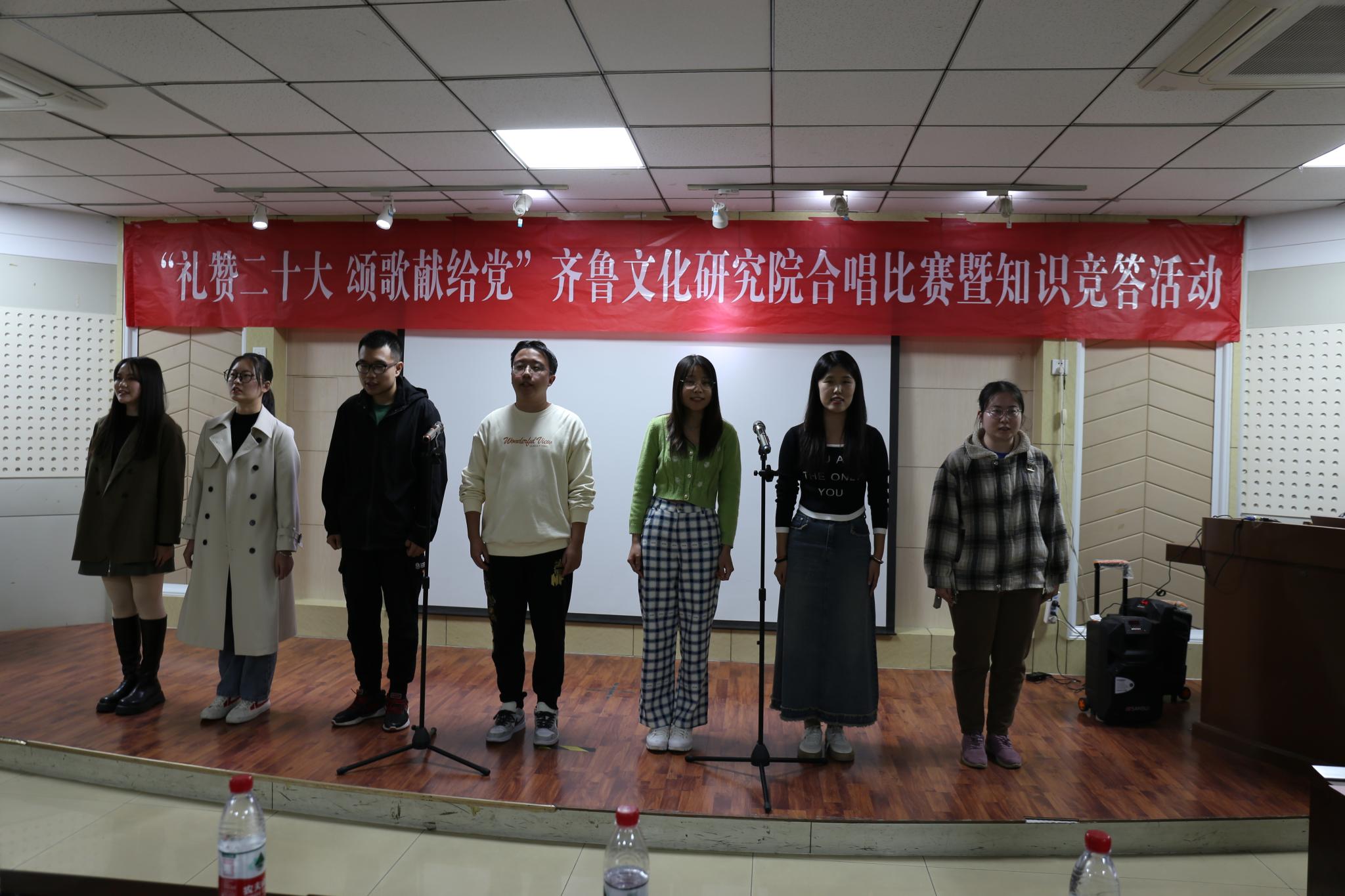 为庆祝党的二十大的胜利召开,10月19日晚,齐鲁文化研究院在千佛山校区逸夫楼106报告厅举办“礼赞二十大,颂歌献给党”合唱比赛暨知识竞答活动。直属单位党委书记胡桂香,直属单位党委副书记、齐鲁文化研究院副院长颜春杰,齐鲁文化研究院院长助理代生,研究院团委书记、学工办主任李莉,青年教师田成浩、刁春辉出席活动并担任活动评委,齐鲁文化研究院全体研究生参加了比赛。