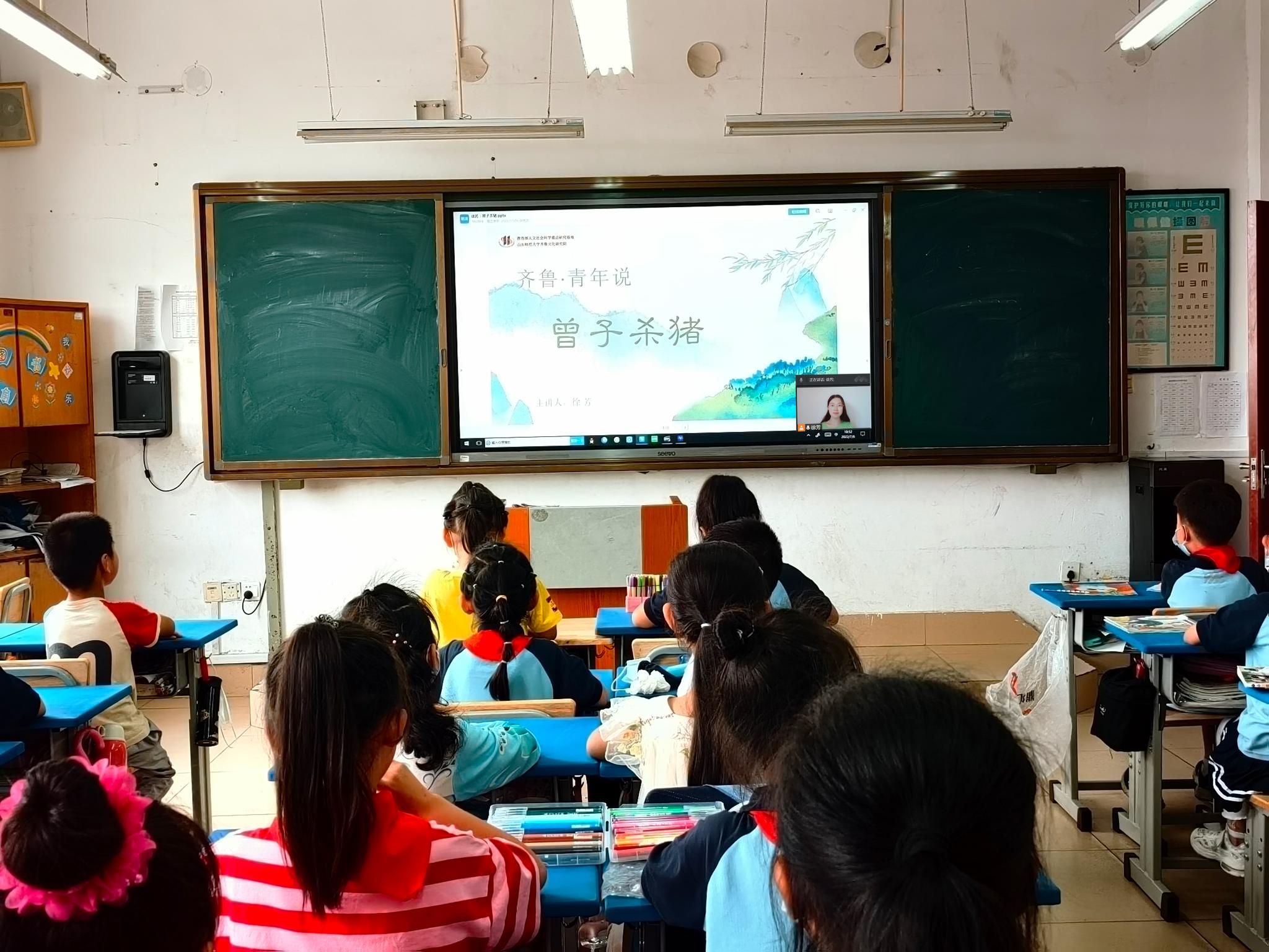 活动开始前,徐芳与桥头小学一年级二班的班主任徐艳波老师进行了协商沟通,认真准备和反复打磨授课内容,根据学生的特点设计了兼具知识性与趣味性的课程内容,深入浅出的为小学生们讲述了曾子的故事,中间穿插动画短片和趣味问答等形式,启发同学们通过故事进行更加深入的思考。虽然远隔屏幕,但课堂上学习氛围浓厚,同学们思维灵活,求知欲十分强烈,在欢声笑语中了解了齐鲁文化,感受到了齐鲁文化的独特魅力。