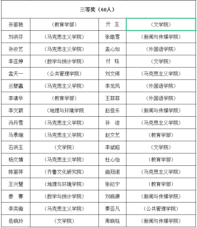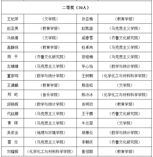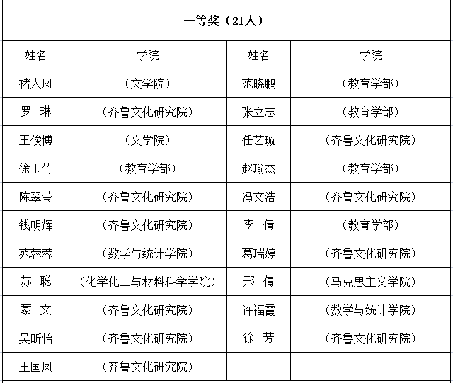 为大力弘扬和传播中华优秀传统文化,引导广大青年学生更加关注和了解齐鲁文化,激发青年学生的文化认同感、自豪感、归属感,坚定文化自信,由校团委主办,齐鲁文化研究院团委承办的“齐鲁文化校园大会”知识竞答活动自启动以来,得到了3000余名同学的大力支持和积极参与,目前活动已圆满结束,现将获奖名单予以公布: