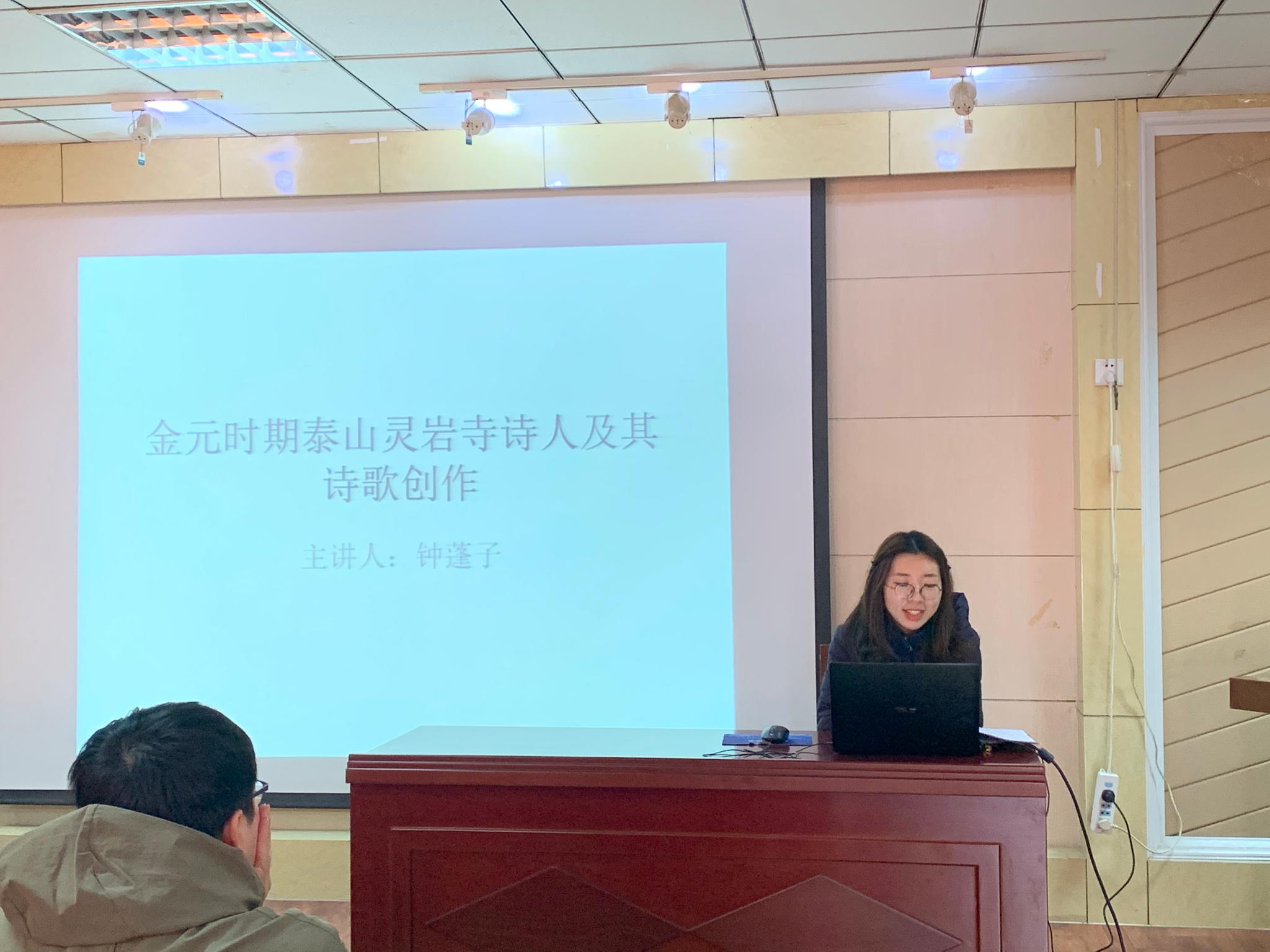钟蓬子同学作了题为《金元时期泰山灵岩寺诗人及诗歌创作概况》的学术报告。她通过梳理相关的诗歌作品认为,金元时期灵岩寺诗歌创作的兴盛与诗人深厚的文化素养和敏锐的感受力是分不开的。诗人善于将自身经历、自然美景与寺庙景观相融合,极具个人特色。