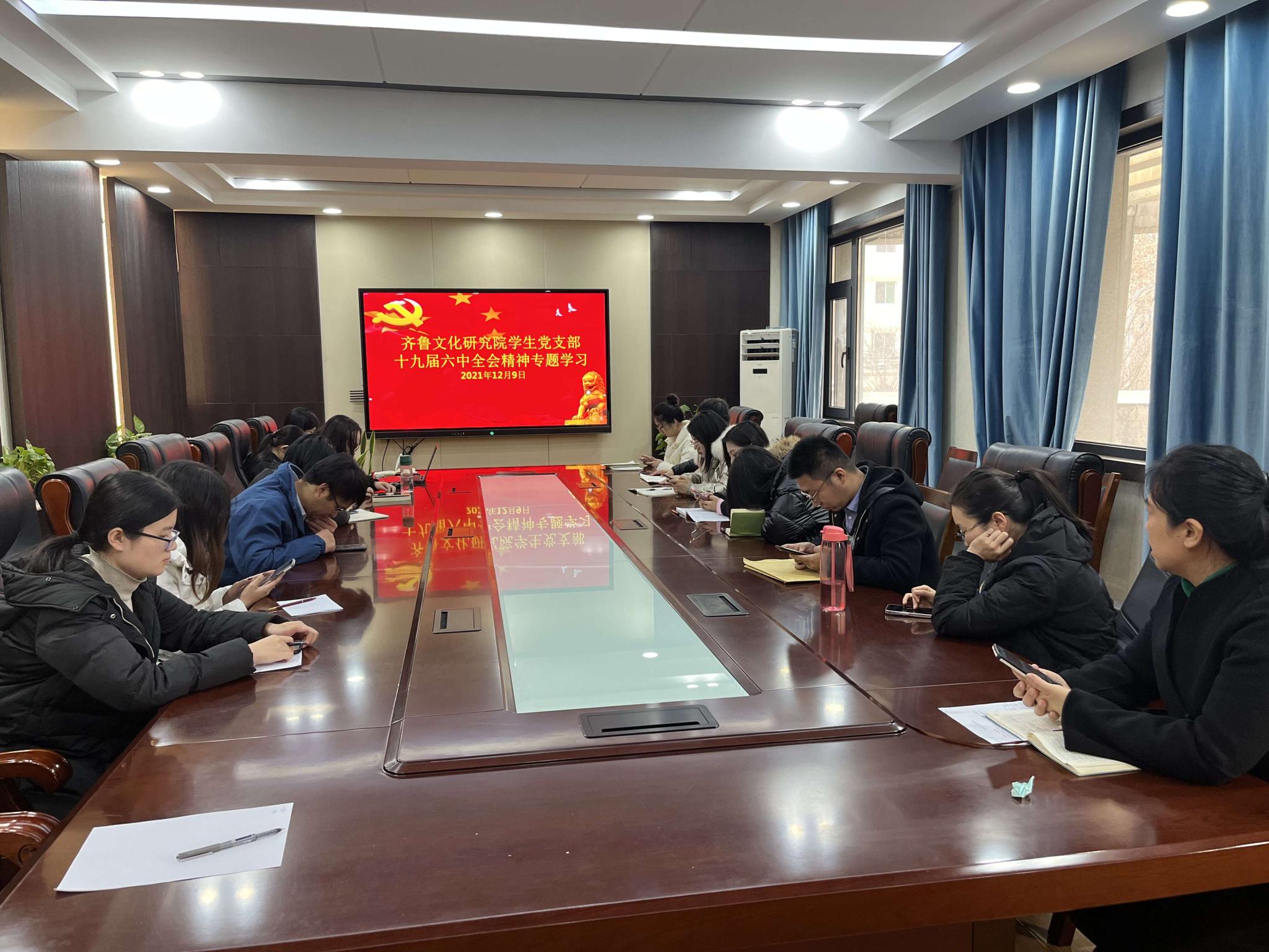 12月9日,齐鲁文化研究院学生党支部书记李莉同志主持召开党支部会议,全体党员在逸夫楼211会议室集体学习贯彻党的十九届六中全会精神。