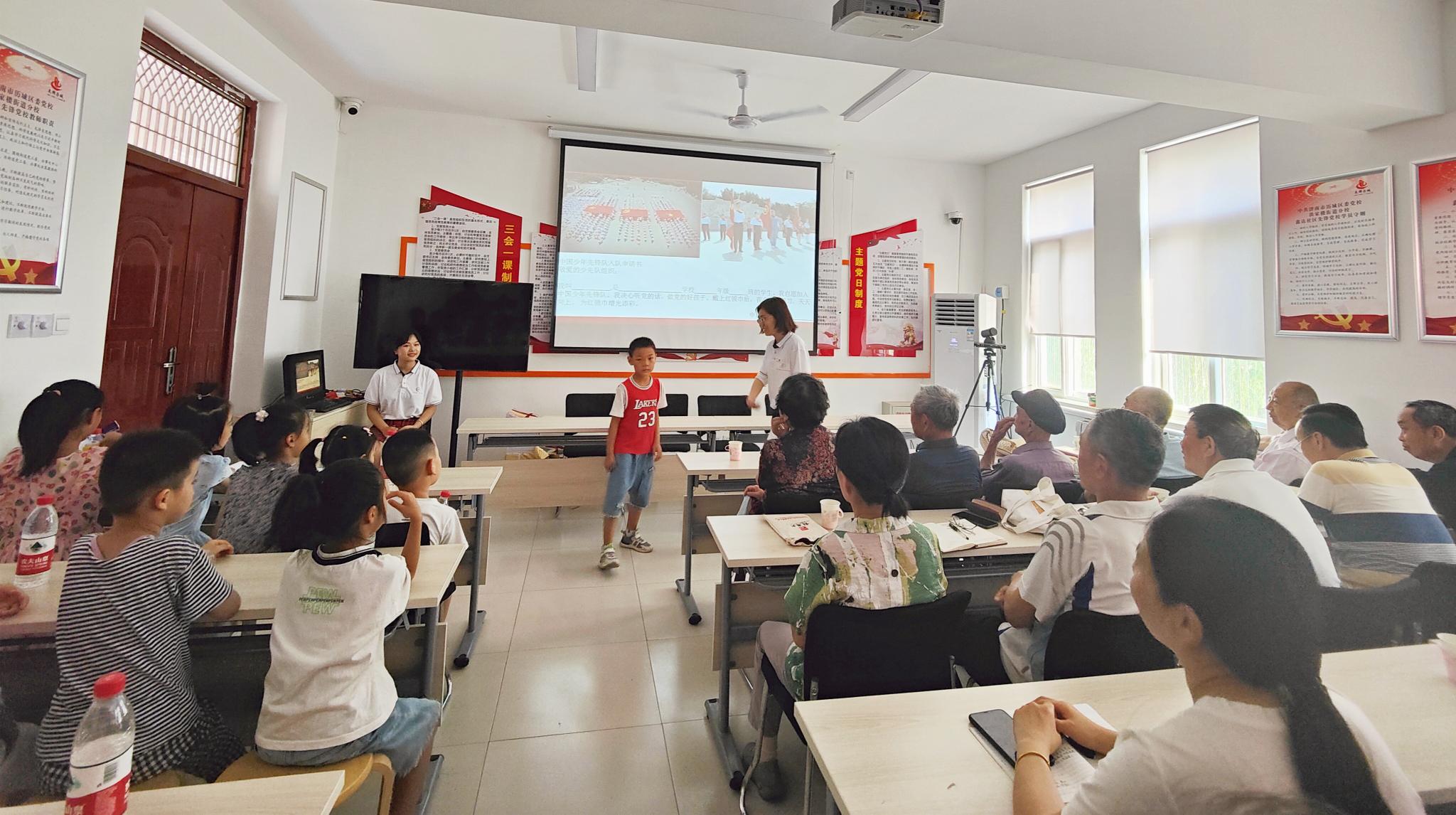 济南洪家楼街道鑫达社区是此次实践活动的第一站。在宣讲前期,宣讲队成员通过街道采访的方式与该社区居民进行了交流沟通,深化了对该社区的了解,从而制定了符合该社区情况的宣讲计划。针对该社区有社区幼儿园的情况,宣讲队宣讲时采用了图文并茂、视频与文字相结合的宣讲形式,以激发小朋友们的兴趣,从而使红色文化厚植童心。宣讲队此次宣讲的内容分别为“少先队、共青团和共产党的基本知识”“山东西海地下医院与小英雄李风岗”以及“山东舰的故事”,宣讲过程中队员与社区居民和幼儿园小朋友们积极互动,学习氛围浓厚。宣讲结束后,宣讲队成员与社区老党员们进行了交流,听他们讲述他们的入党故事以及他们所知道的红色事迹,通过交流学习,队员们的思想觉悟有了进一步的提高,对于山东地区的红色文化也有了更深入的了解。实践队队员陈嫣虹表示:“此次社会实践将学习到的四史知识与社会实践相结合,不仅使红色文化得到了很好的宣传和发扬,而且也让自己在活动过程中学到了新的知识,更进一步的从党史中感受到了智慧和力量。”