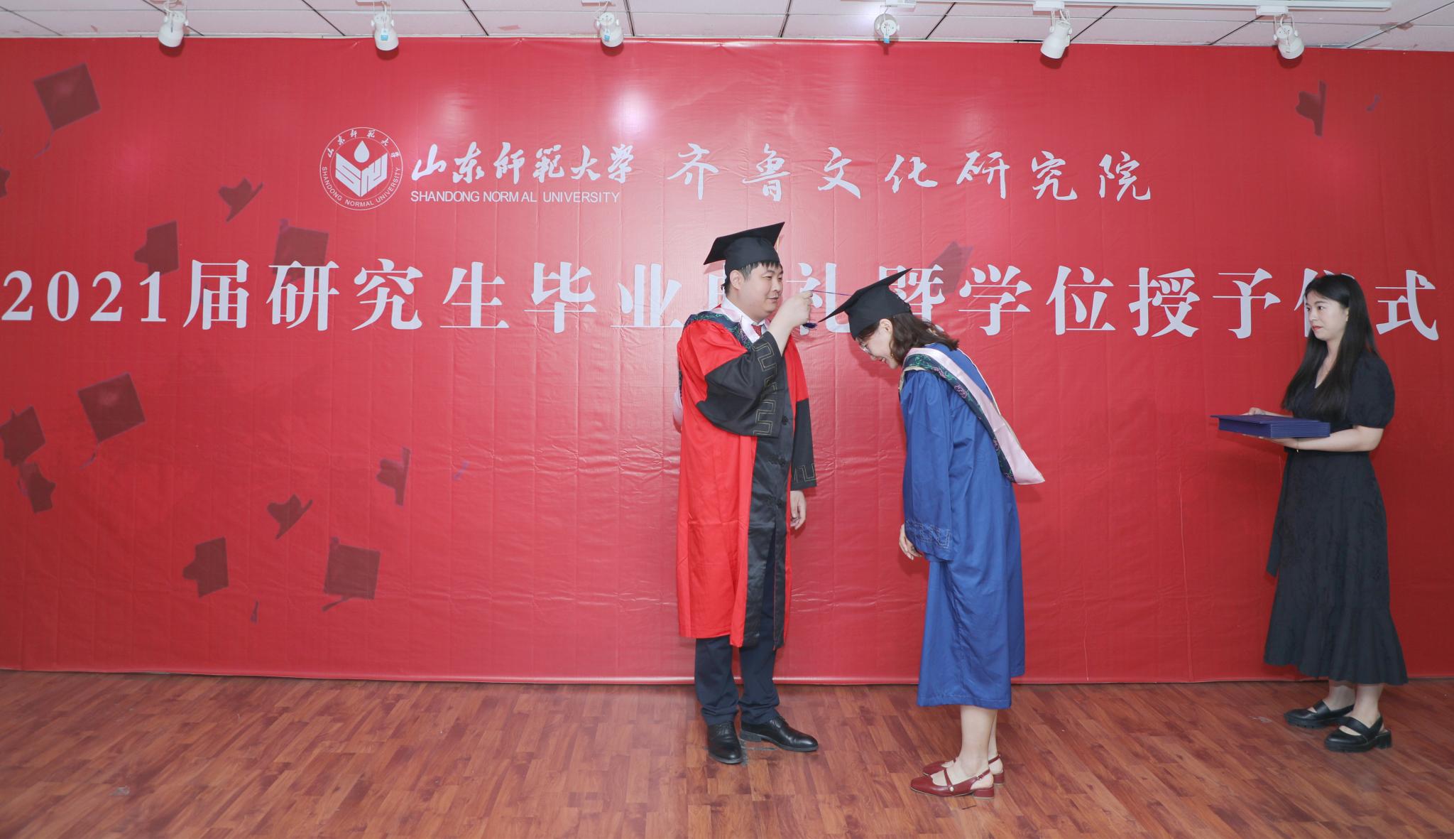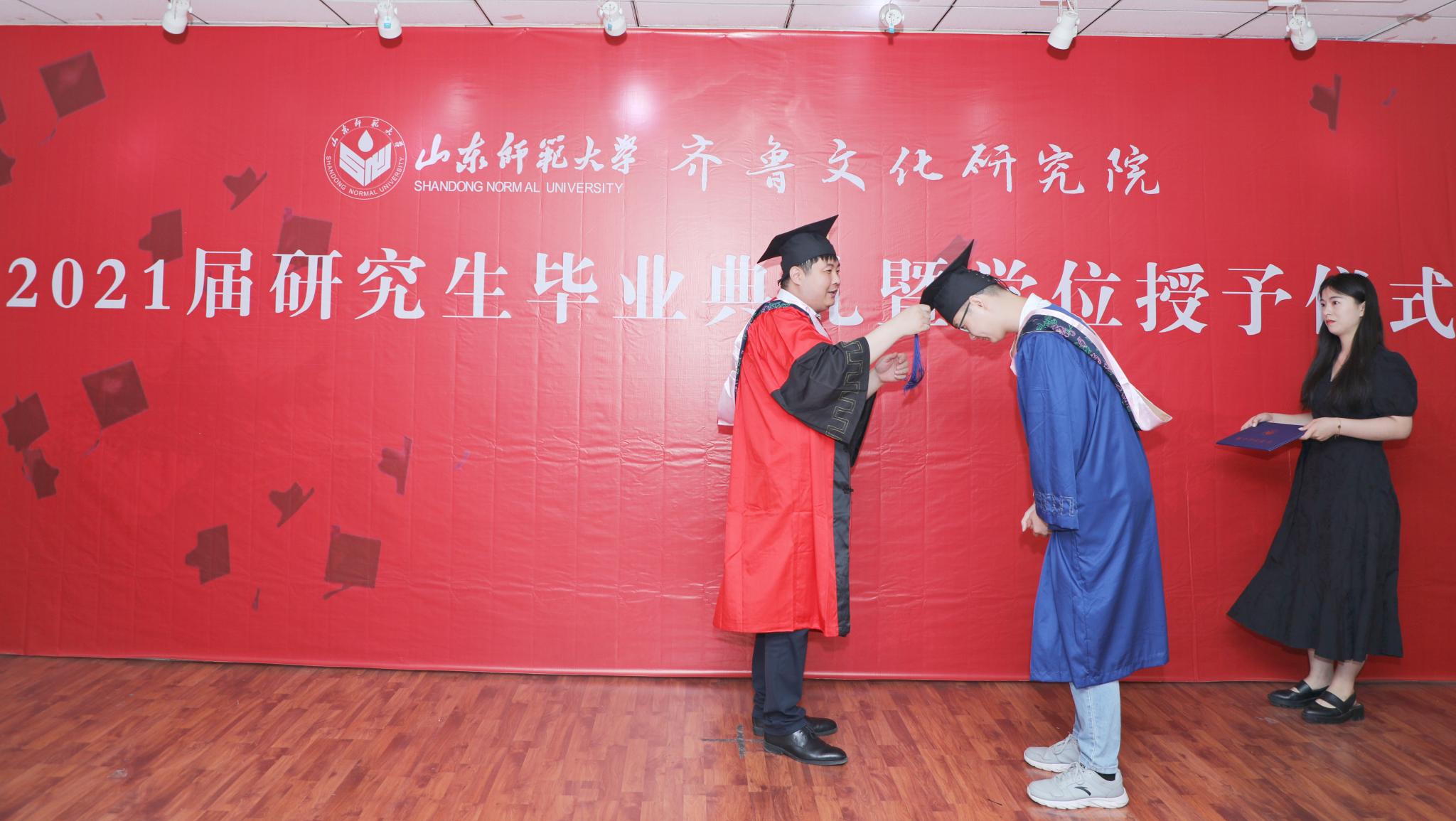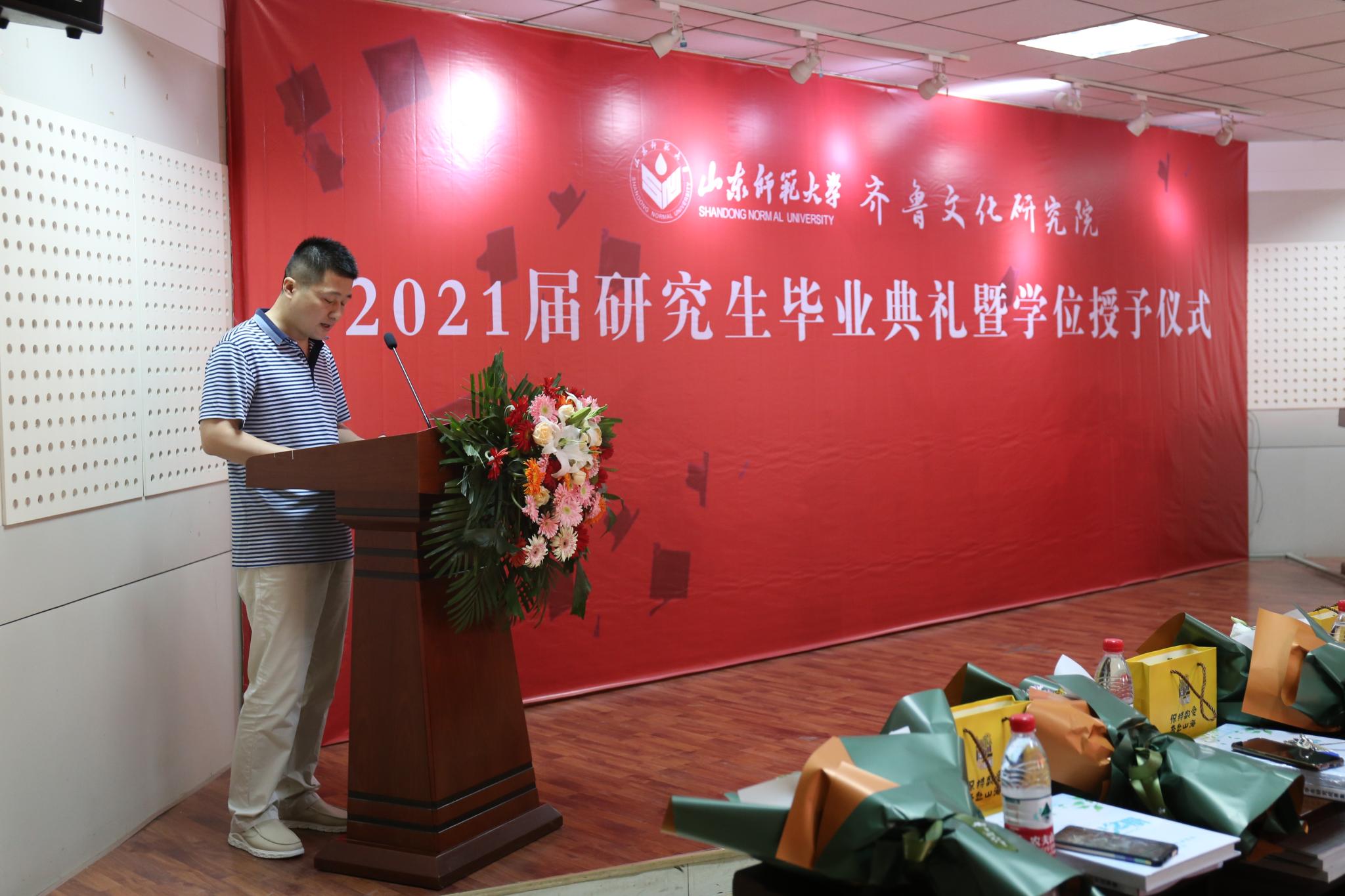 6月23日上午,齐鲁文化研究院2021年研究生毕业典礼暨学位授予仪式在逸夫楼106报告厅隆重举行。直属单位党委书记胡桂香,直属单位党委副书记、齐鲁文化研究院副院长颜春杰,齐鲁文化研究院副院长吕文明以及研究院全体师生参加了活动,典礼由齐鲁文化研究院学工办主任、团委书记李莉主持。