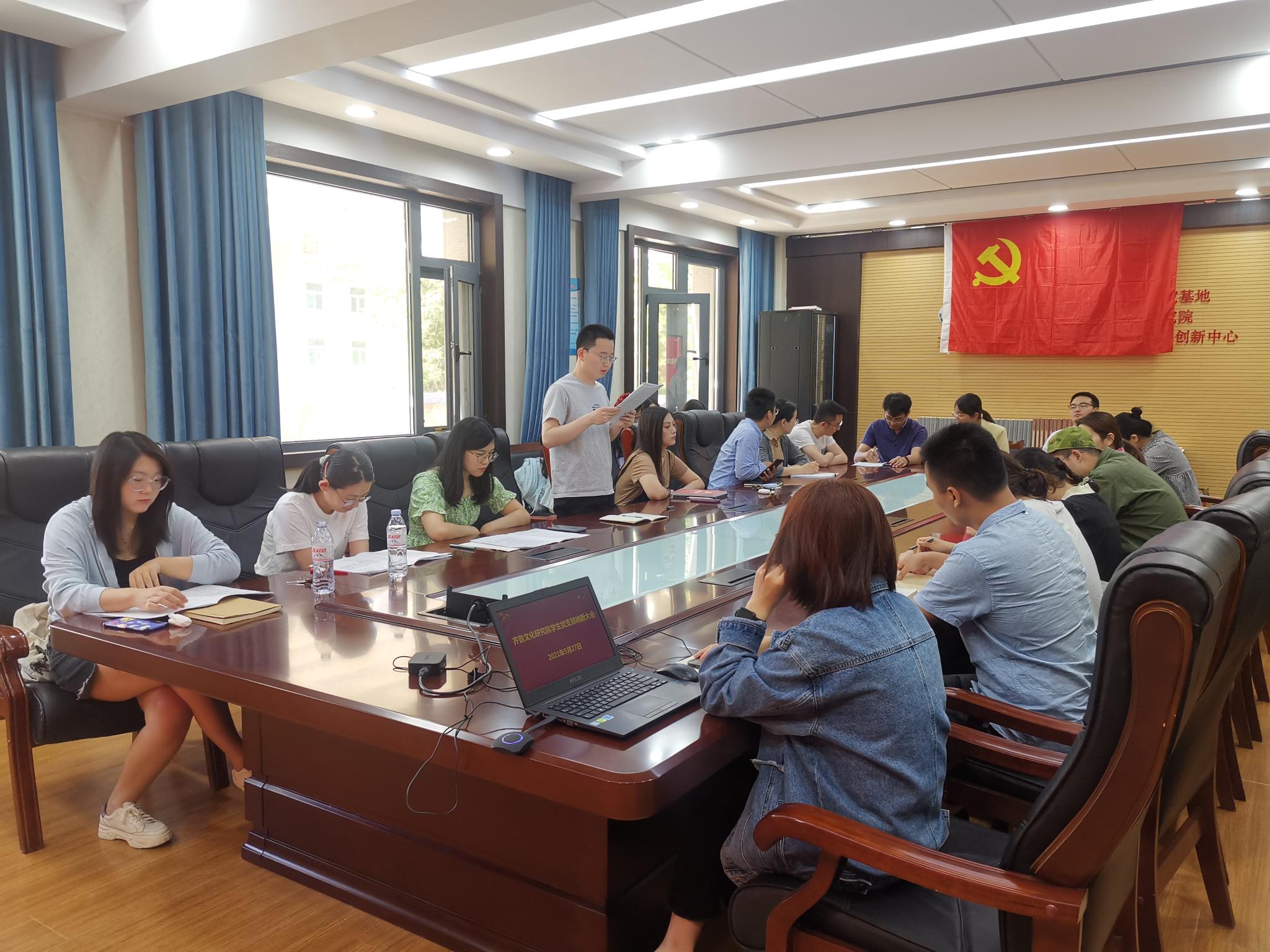 5月27日上午,齐鲁文化研究院学生党支部在逸夫楼211会议室召开党员大会,讨论党员发展对象职伟、李金璇、王绍之、郑立娟四名同志的入党事宜。会议由党支部书记李莉主持。