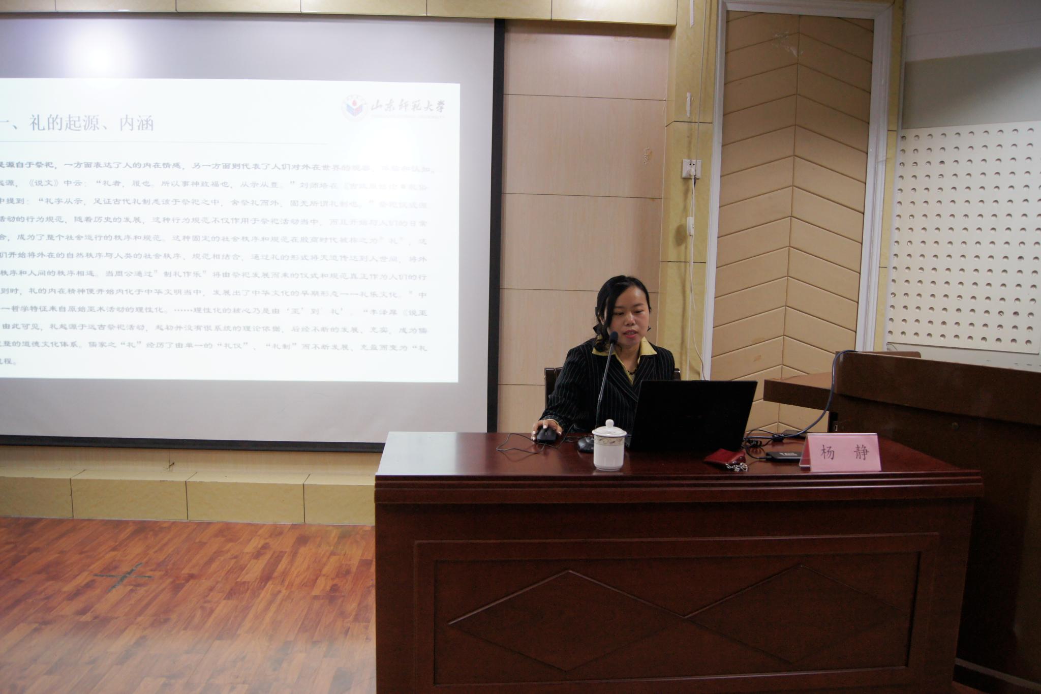 4月26日晚,由齐鲁文化研究院和研究生工作部联合举办的“治学·修身研究生学术论坛”在逸夫楼106报告厅举行。齐鲁文化研究院青年教师杨静博士作了题为“宋代理学视域下的礼学思想”的学术报告。报告会由院长助理代生副教授主持,研究院师生40余人聆听了报告。