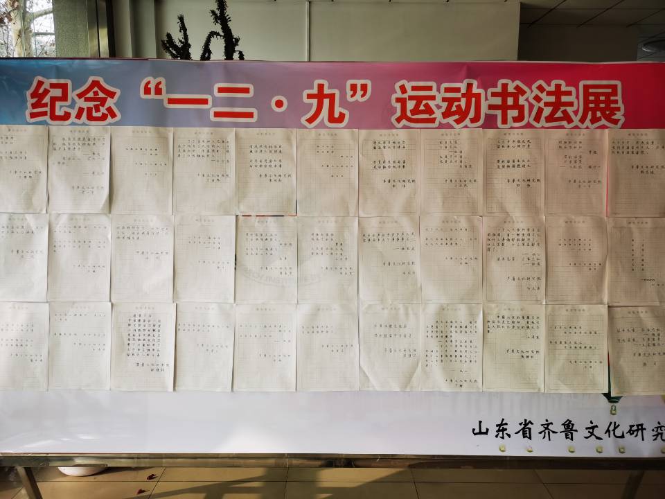 12月9日,为纪念“一二·九”运动85周年,齐鲁文化研究院举办纪念“一二·九”运动书法展。书法展得到了齐鲁文化研究院全体师生们的积极响应,大家踊跃参与,营造了浓厚的爱国主义氛围。