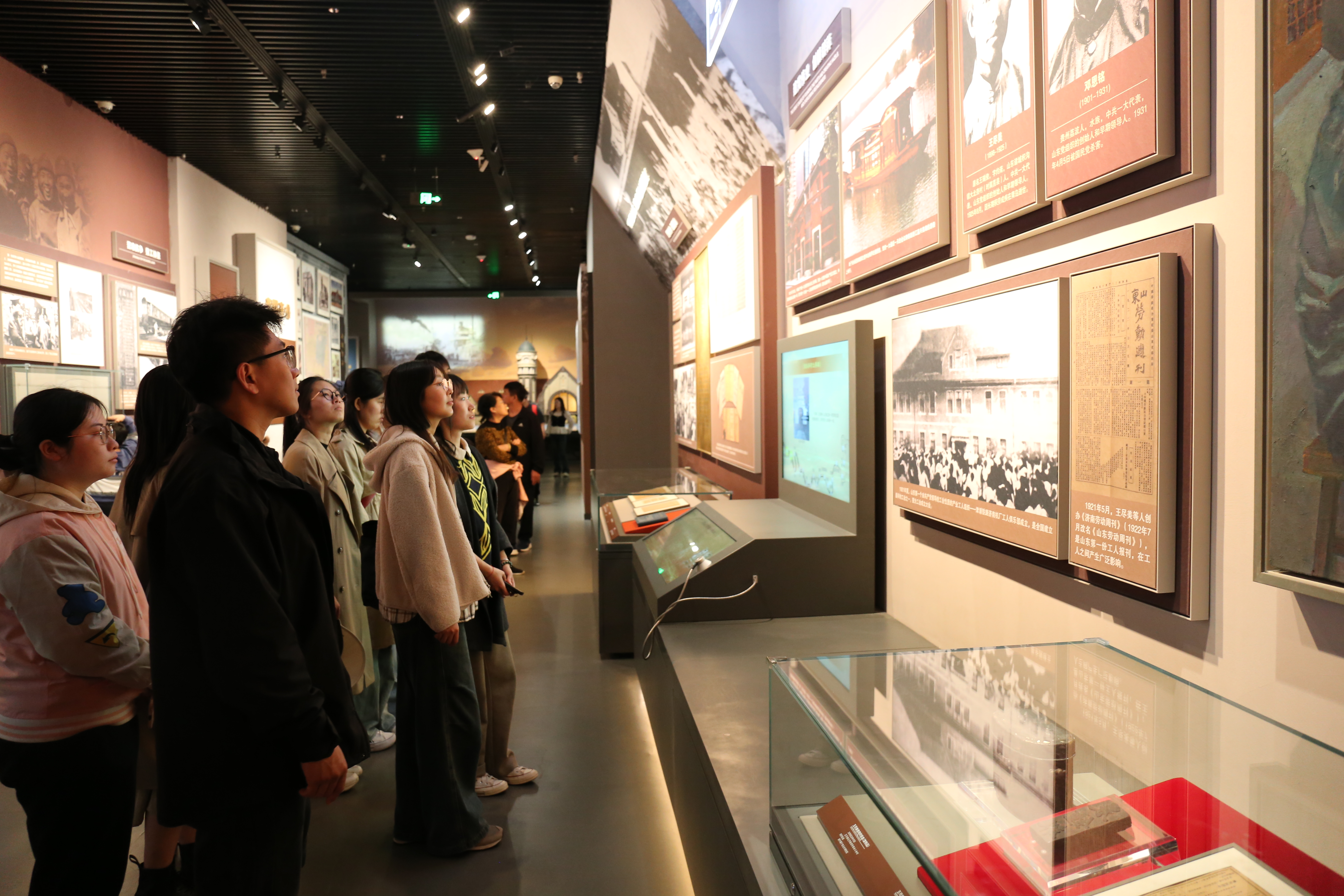 展厅共分“时代嬗变”“光耀齐鲁”“阔步征程”三部分,通过一件件丰富的文献史料和文物展品,梳理了山东近现代革命历史发展脉络,展现了中国式现代化道路百年探索的齐鲁缩影。伴随着悠扬动听的沂蒙小调和声情并茂的讲解,从百年前的屈辱战乱到新时代的飞速发展,大家通过橱窗中的历史文物、革命英雄的英勇事迹等,重温了那段波澜壮阔的峥嵘岁月,并深刻理解了革命战士的凛然风骨和浩然正气,以及发生在这片红色热土上的不朽史诗。