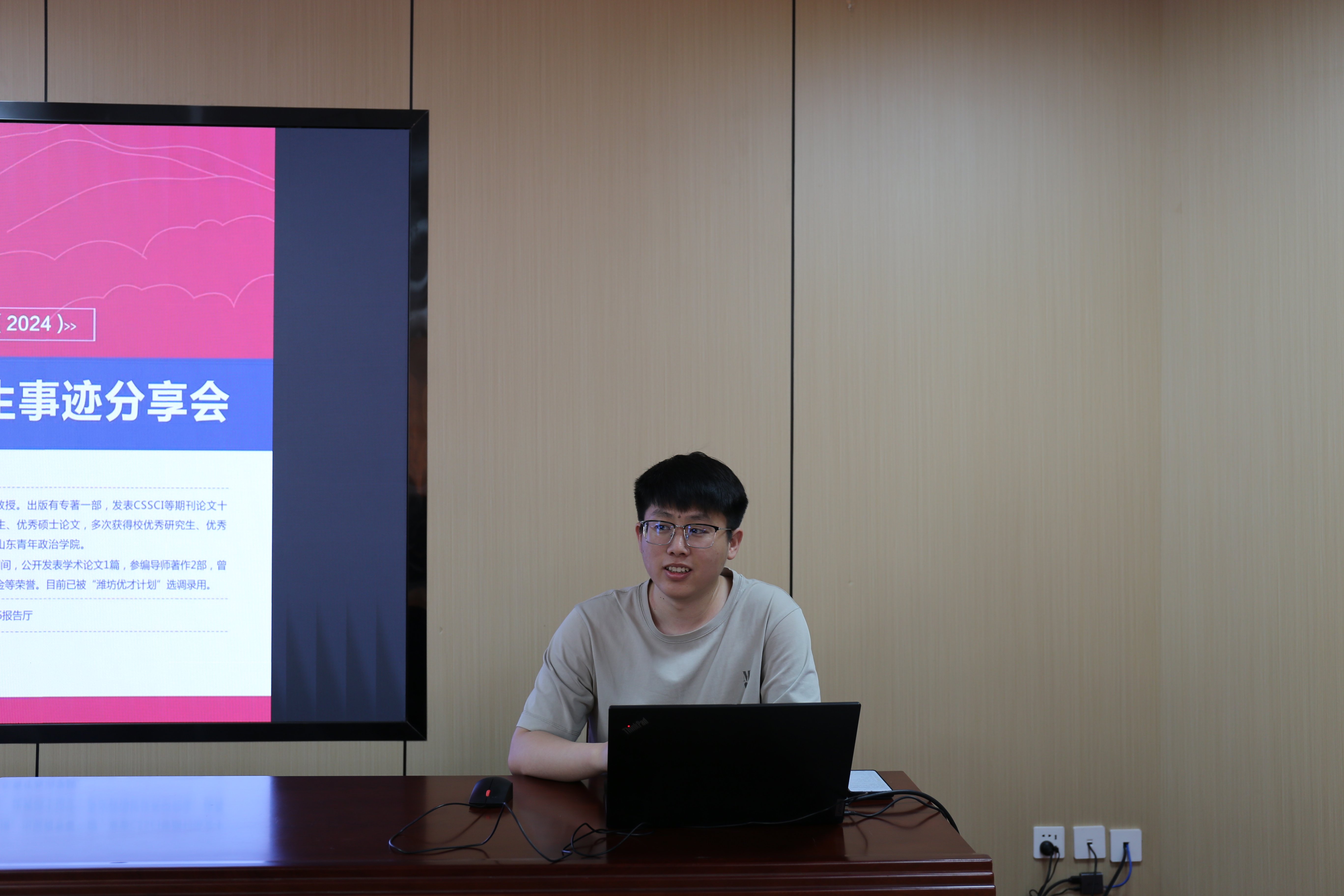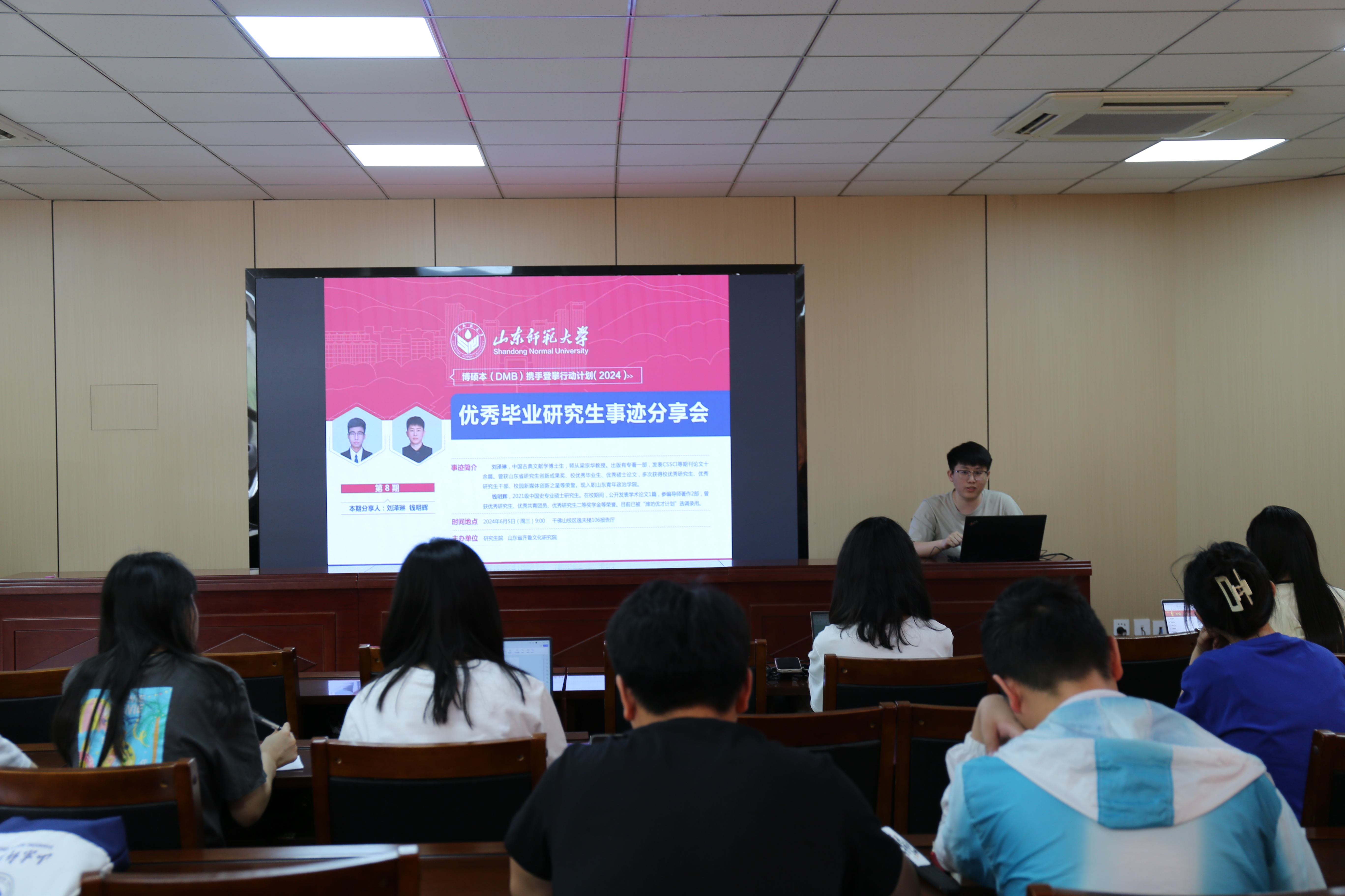 6月5日上午,由齐鲁文化研究院研究生会、德廉学社主办的第8期“优秀毕业研究生事迹分享会”于逸夫楼106报告厅举办。会议邀请2024届毕业研究生刘泽琳、钱明辉做经验分享。本次分享会由齐鲁文化研究院学工办主任、团总支书记杜云飞主持。2022、2023级全体研究生参加会议。
