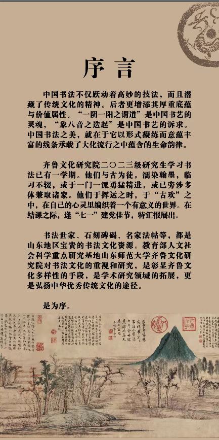 近日,齐鲁文化研究院主办,德廉学社协助举办的“阴阳之义”——2023级研究生书法史论与实践课结课展览成功举行。全体2023级硕、博研究生及部分教师的书法作品在逸夫楼一楼大厅展出。