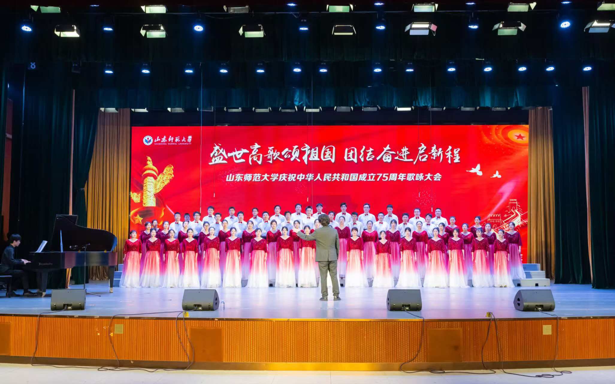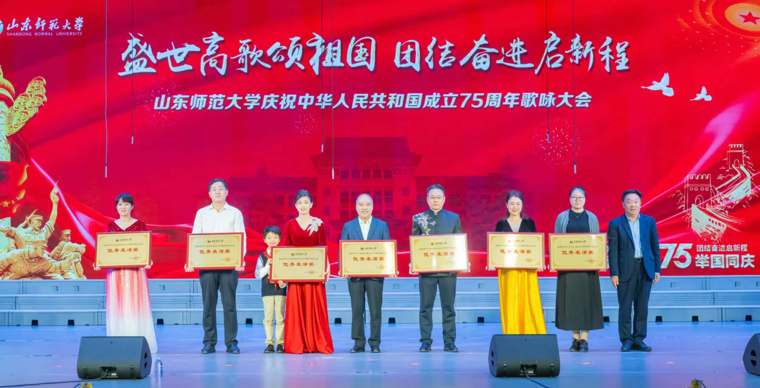 “七十五载迎盛世,齐鲁歌声庆芳华”,10月31日,山东师范大学“庆祝中华人民共和国成立75周年歌咏大会”在山东师范大学千佛山校区大礼堂隆重举行。齐鲁文化研究院师生以嘹亮动听的歌声精彩演绎《奉献》和《团结就是力量》两首歌曲,经过激烈角逐,最终荣获“优秀表演奖”。