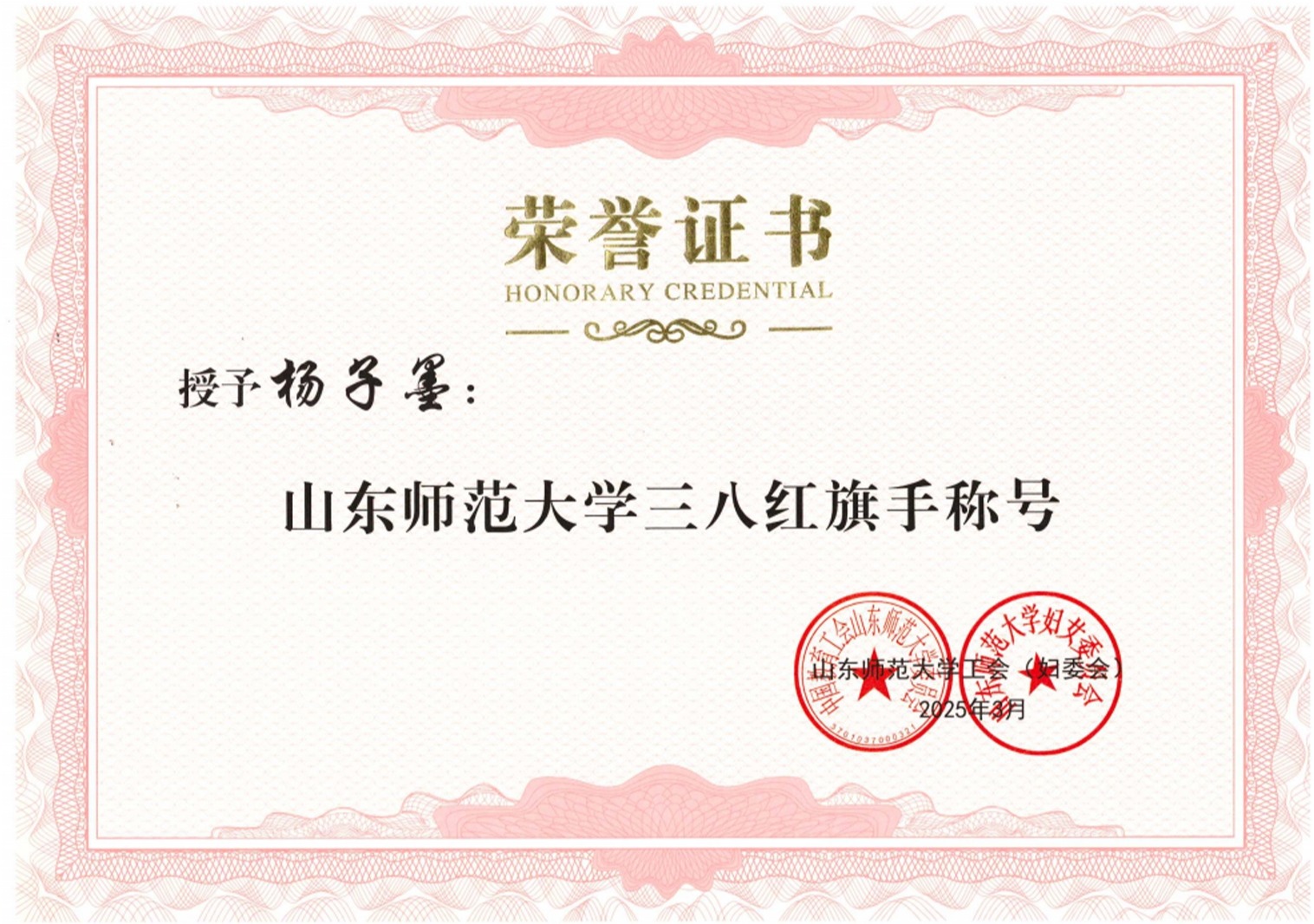 3月7日上午,山东师范大学“跟党奋进新征程·巾帼建功新时代”庆祝“三八”国际妇女节先优表彰座谈会在千佛山校区文化楼四层会议室隆重举行。我院杨子墨副教授荣获2023-2024年度“三八红旗手”称号。