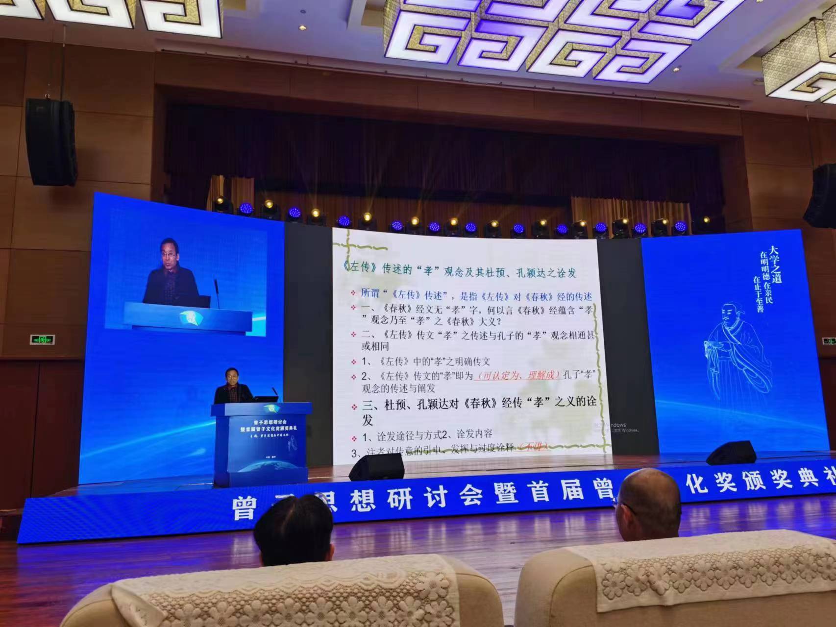 “2023海峡两岸曾子思想研讨会暨首届曾子文化奖颁奖典礼”于3月24日-3月26日在山东嘉祥宗圣宾舍举办,来自海峡两岸的专家和学者,围绕“曾子思想与中国文化”的活动主题,利用丰富的曾子文化资源,探讨当下如何传承与弘扬曾子思想。山东师范大学齐鲁文化研究院的闫春新教授应邀作了《<左传>传述的“孝”观念及其杜预、孔颖达之诠发》主题发言,获得了台湾学者蔡家和教授等专家的高度评价,取得了较好的学术反响。
