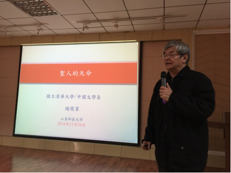 2016年11月24日15时,齐鲁文化研究院于本院一楼报告厅进行了由清华大学中国文学系讲座教授杨儒宾先生关于“圣人的天命”的讲座。出席本次讲座的有山东大学哲学与社会发展学院教授傅永军老师,齐鲁文化研究院部分老师与一年级和二年级的研究生共同聆听了本次讲座。