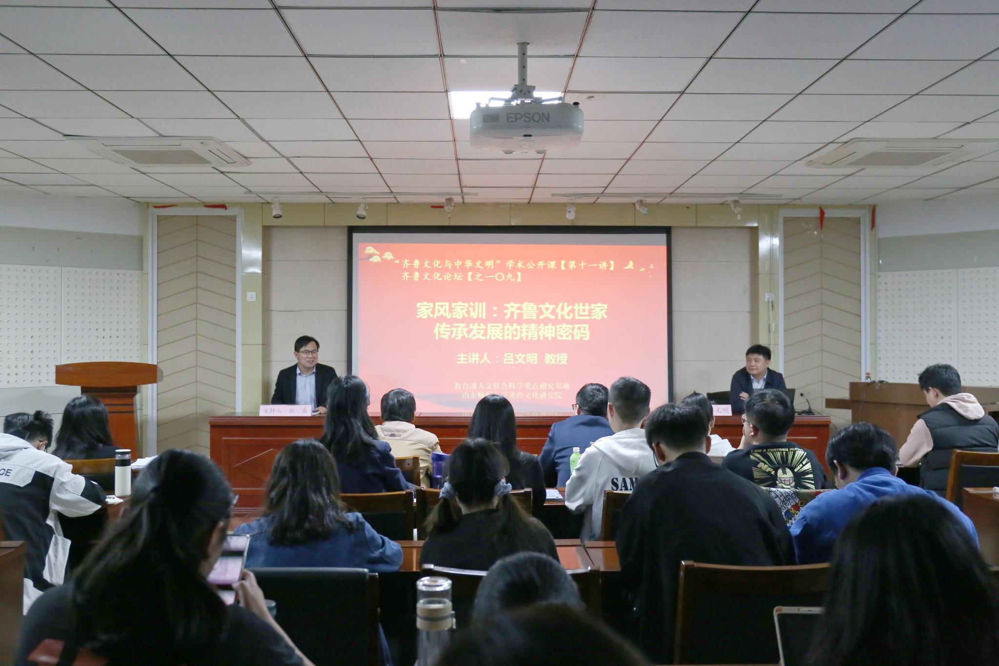 11月17日晚,由教育部人文社会科学重点研究基地山东师范大学齐鲁文化研究院主办的“齐鲁文化与中华文明”学术公开课第十一讲,在山东师范大学千佛山校区逸夫楼报告厅举行。本次公开课由国家万人计划青年拔尖人才、泰山学者青年专家、齐鲁文化研究院院长、博士生导师吕文明教授担任主讲嘉宾,题目是《家风家训:齐鲁文化世家传承发展的精神密码》。齐鲁文化研究院部分教师、全体研究生以及千佛山校区部分研究生参加讲座。讲座由齐鲁文化研究院副院长、博士生导师张磊教授主持。