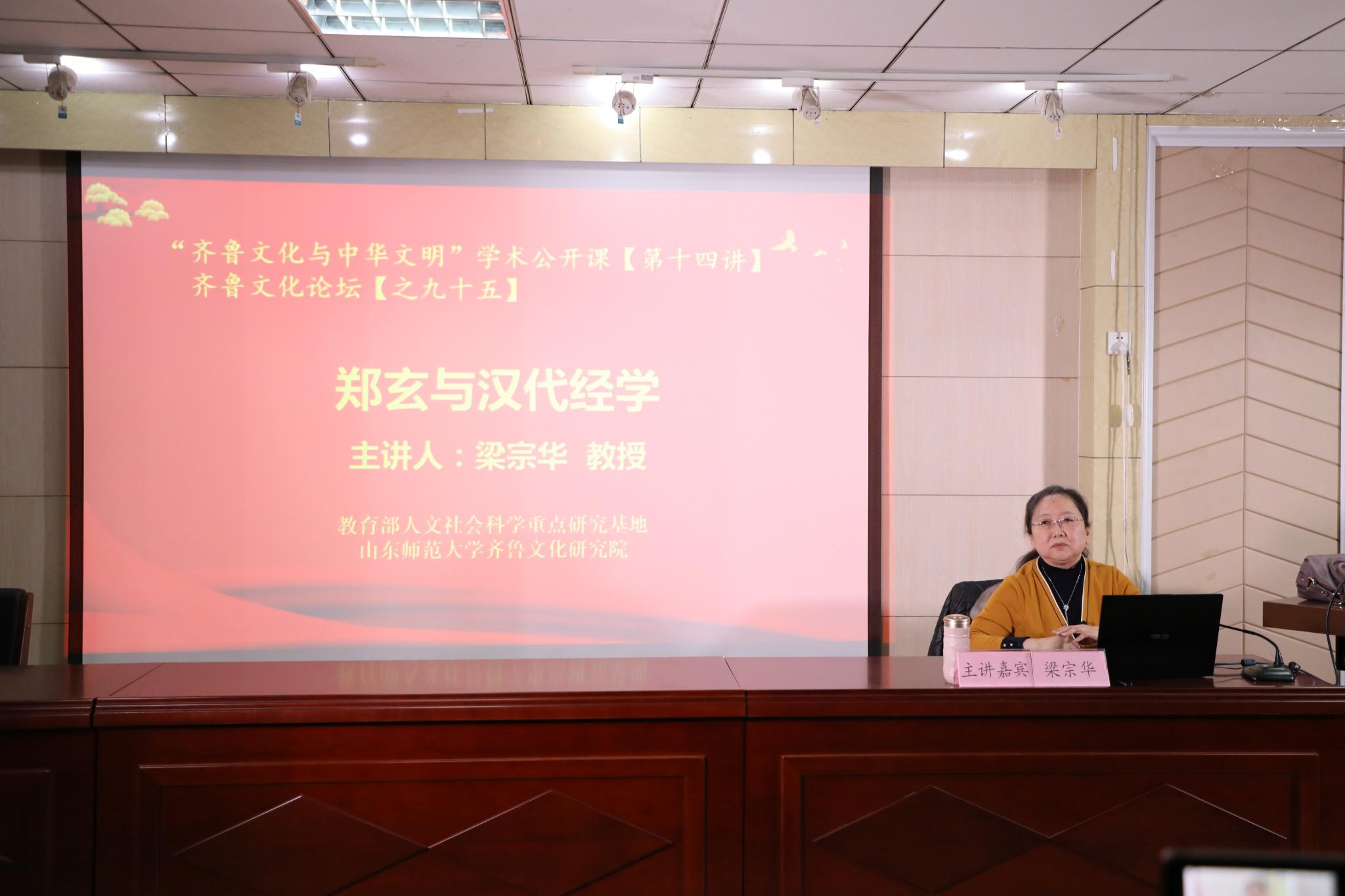 1216日,由教育部人文社会科学重点研究基地山东师范大学齐鲁文化研究院主办的“齐鲁文化与中华文明”学术公开课第十四讲在山东师范大学千佛山校区逸夫楼报告厅举行。山东师范大学齐鲁文化研究院博士生导师梁宗华教授担任本次公开课的主讲嘉宾,讲座的题目是《郑玄与汉代经学》。直属单位党委副书记、齐鲁文化研究院副院长颜春杰和研究院全体师生、学校部分本科生聆听了此次报告。讲座由齐鲁文化研究院博士生导师张磊副教授主持。