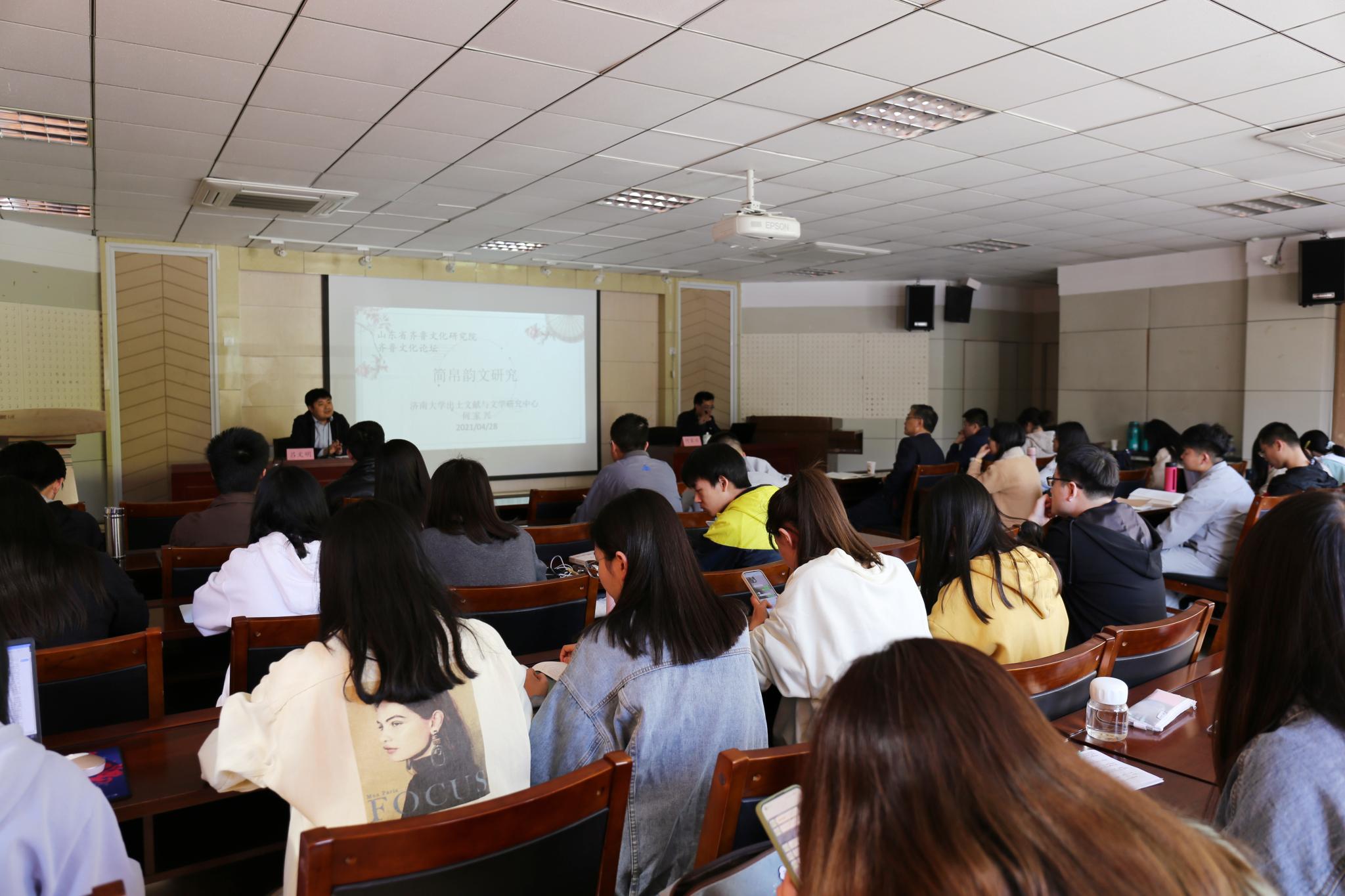 4月28日下午,齐鲁文化研究院主办的齐鲁文化论坛第78期在千佛山校区逸夫楼106报告厅举行。论坛邀请济南大学出土文献与文学研究中心执行主任,文学院副院长,山东省高校“青创团队”负责人何家兴教授作了题为“简帛韵文研究”的讲座。讲座由齐鲁文化研究院副院长吕文明教授主持,直属单位党委副书记、研究院副院长颜春杰、院长助理代生副教授等五十余名师生聆听了报告。