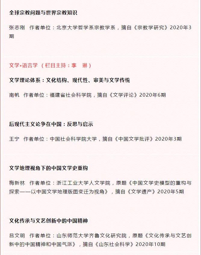 近日,齐鲁文化研究院副院长、博士生导师吕文明教授发表在《山东社会科学》2020年第10期的论文《文化传承与文艺创新中的中国精神和中国气派》,被《中国社会科学文摘》2021年第2期“文学·语言学”栏目主体转载,转载题目为《文化传承与文艺创新中的中国精神》。