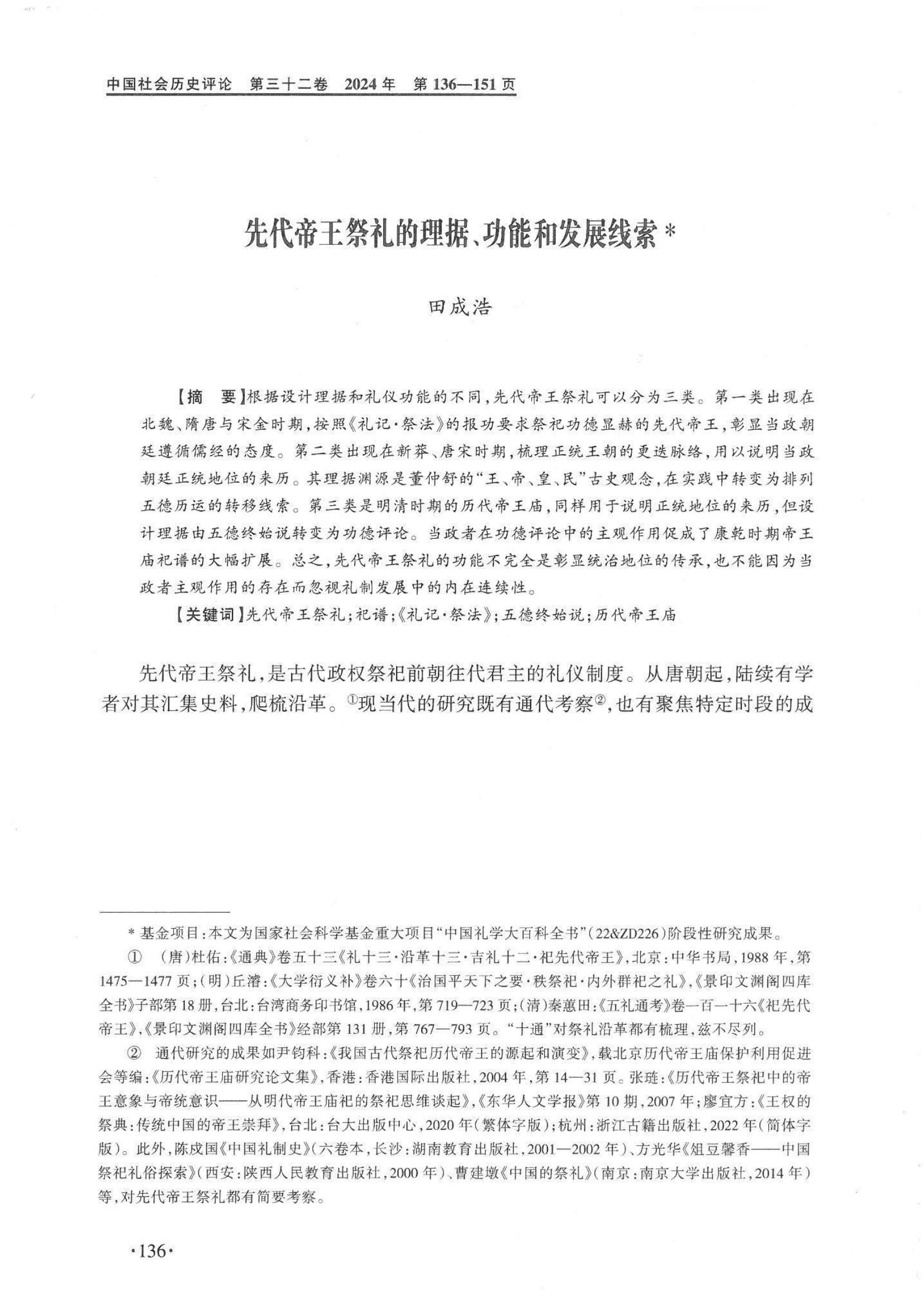 近日,《中国社会历史评论》(CSSCI集刊)第32卷刊发了齐鲁文化研究院青年教师田成浩博士的学术文章《先代帝王祭礼的理据、功能和发展线索》。全文1万9千余字。