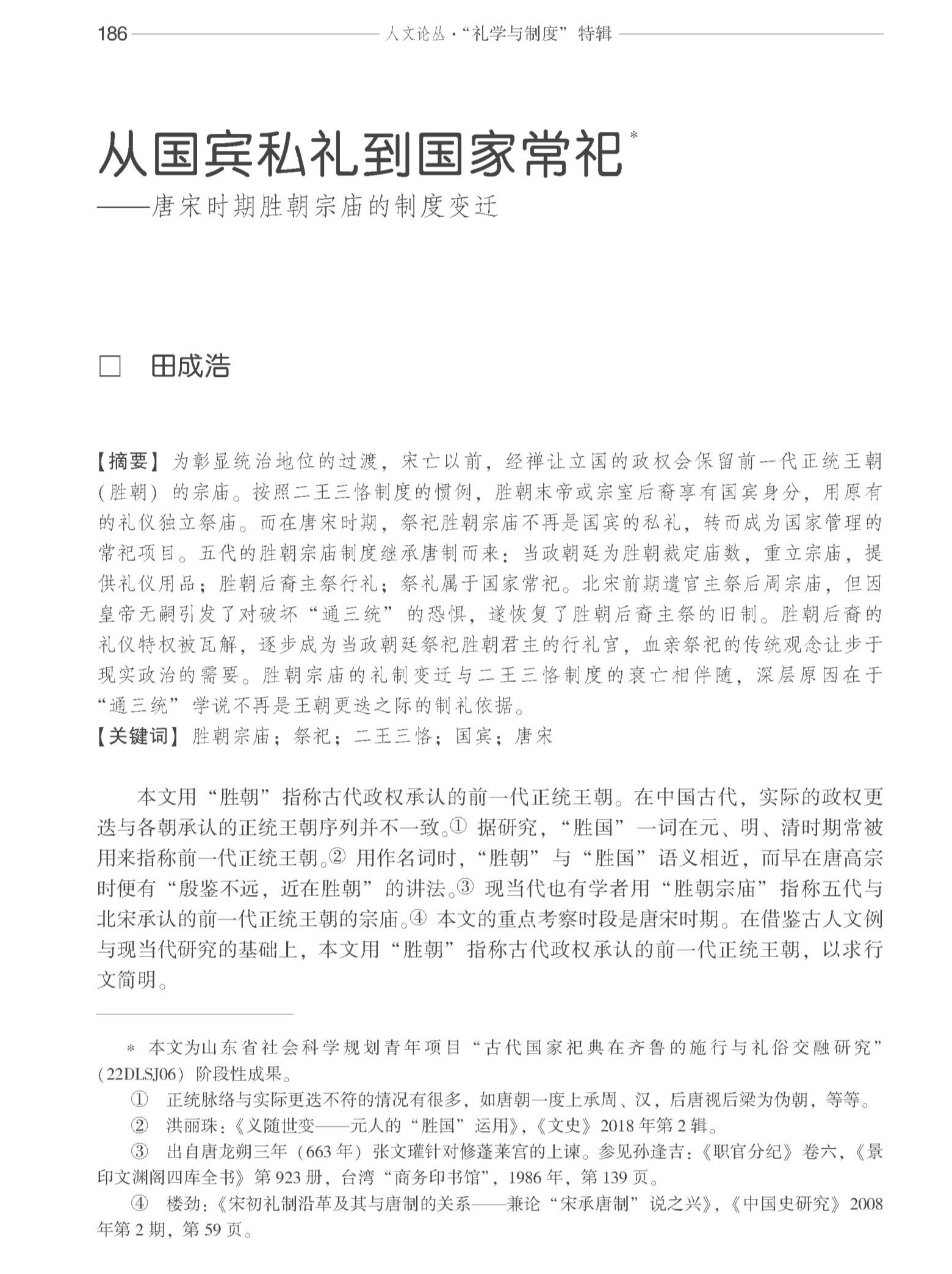 近日,《人文论丛》(CSSCI集刊)“礼学与制度”特辑刊发了齐鲁文化研究院青年教师田成浩博士的学术文章《从国宾私礼到国家常祀:唐宋时期胜朝宗庙的制度变迁》。全文分“唐之前的二王三恪制度与胜朝宗庙”“五代的胜朝宗庙制度”“五代胜朝宗庙制度承袭唐制的线索”“北宋胜朝宗庙制度的曲折变迁”“此消彼长:祭祀主导权的转移及其原因”5个部分,共2万余字。