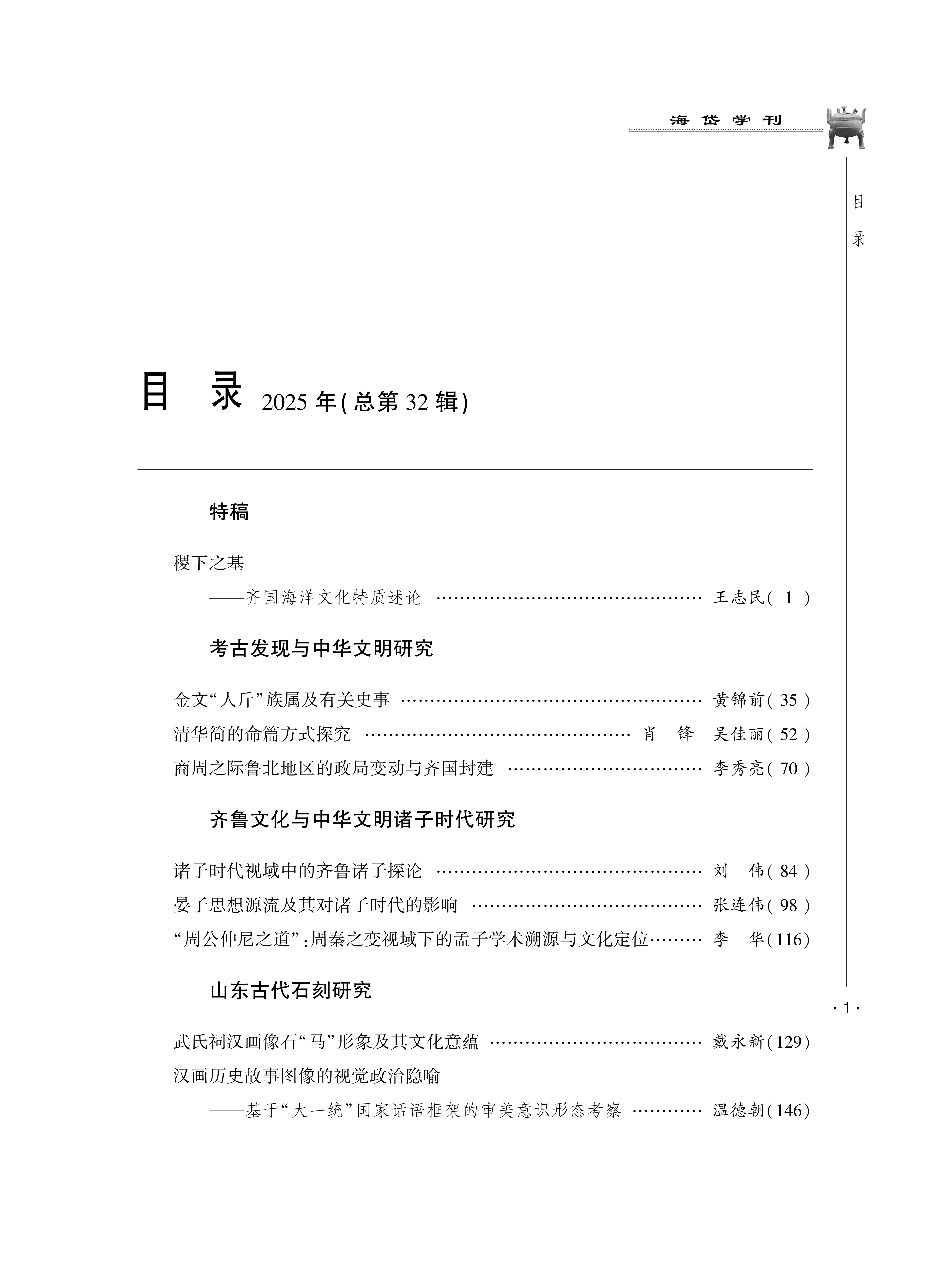 本辑“特稿”刊发了山东师范大学特聘资深教授王志民先生的文章《稷下之基——齐国海洋文化特质述论》。文章从东夷海洋基因与周制融合的夷夏复合结构入手,系统阐释了海洋经济、开放心态与尊贤制度如何共同孕育了稷下学宫“百家争鸣、兼收并蓄”的文化气象。
