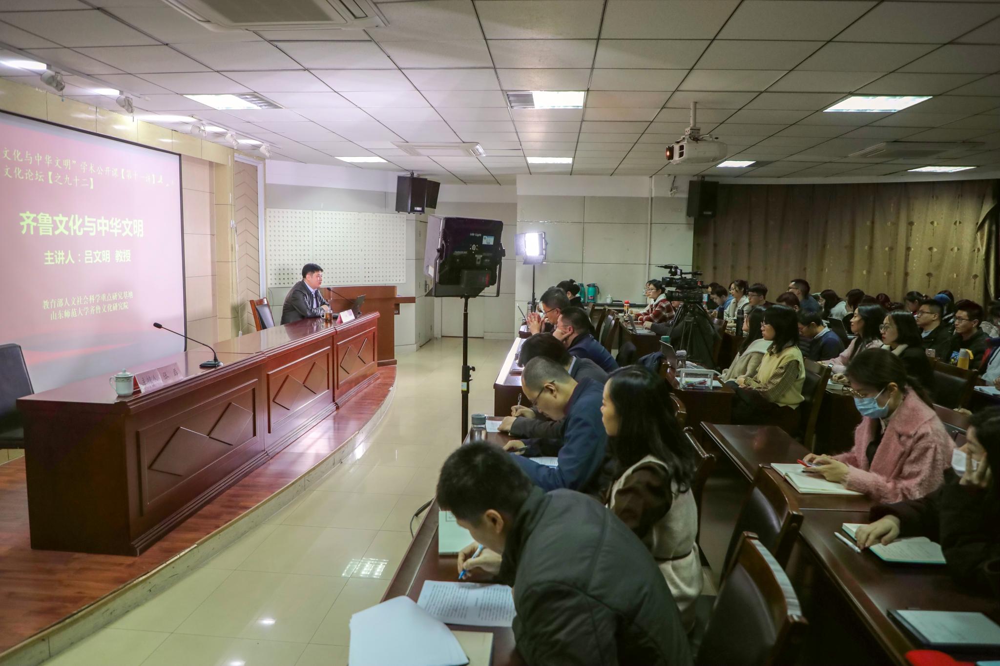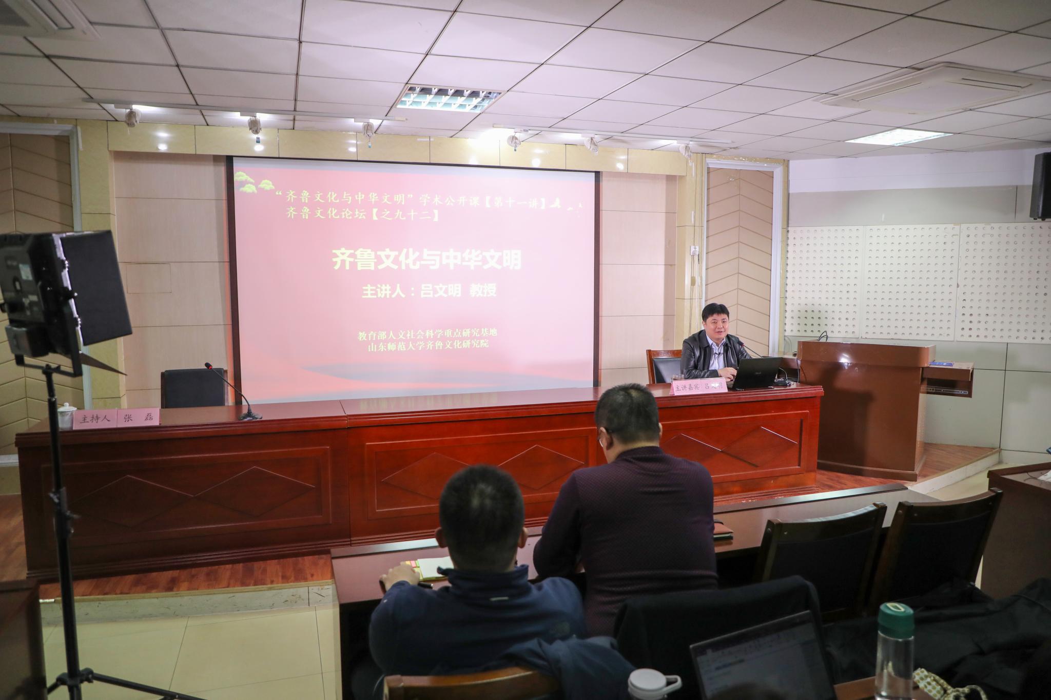 11月25日,由教育部人文社会科学重点研究基地山东师范大学齐鲁文化研究院主办的“齐鲁文化与中华文明”学术公开课第十一讲,在山东师范大学千佛山校区逸夫楼报告厅举行。国家万人计划青年拔尖人才、泰山学者青年专家,齐鲁文化研究院副院长、博士生导师吕文明教授担任本次公开课的主讲嘉宾,讲座的题目是《齐鲁文化与中华文明》。研究院全体师生、学校部分本科生参加讲座。讲座由齐鲁文化研究院博士生导师张磊副教授主持。