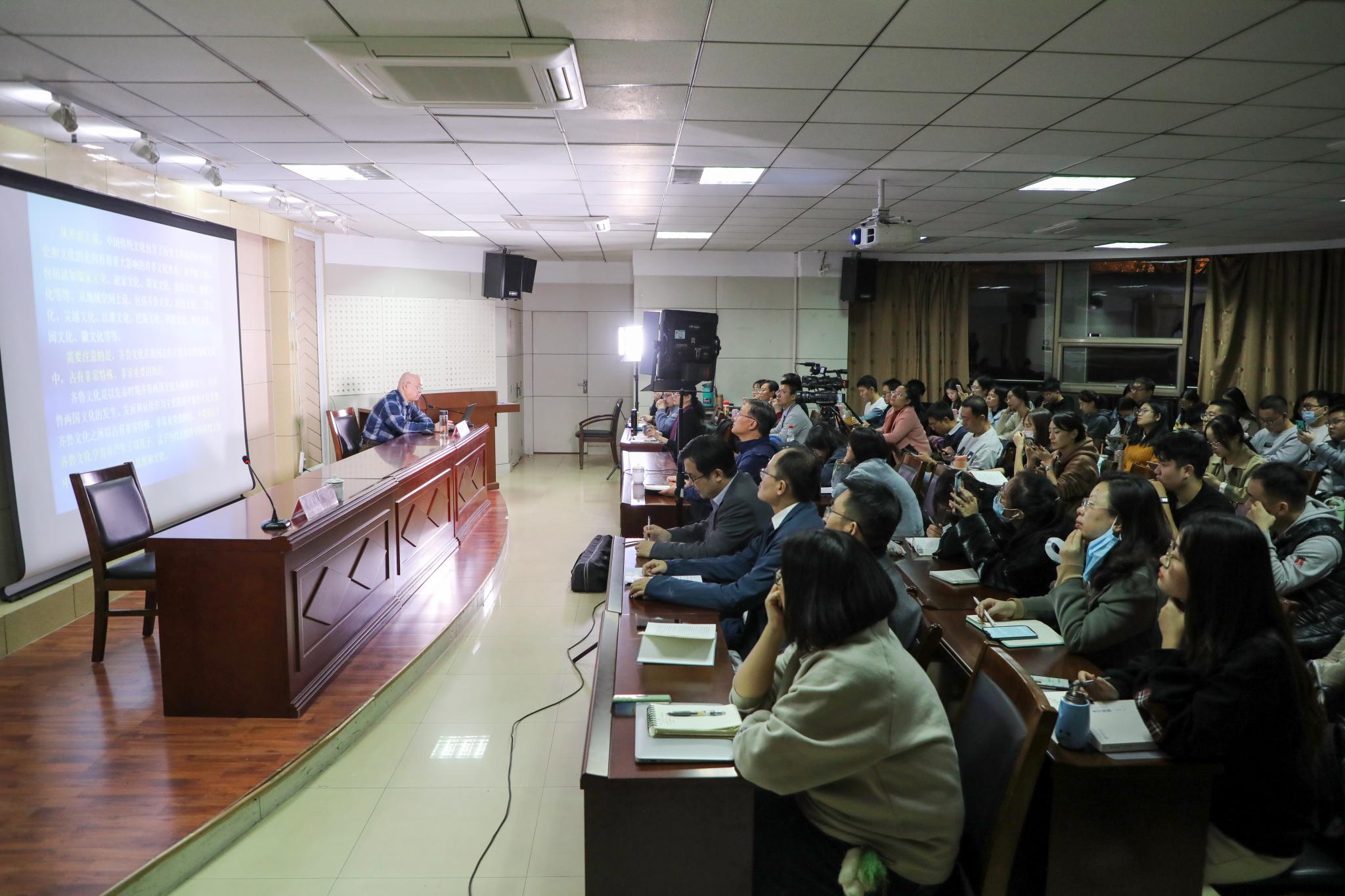 11月18日,由教育部人文社会科学重点研究基地山东师范大学齐鲁文化研究院主办的“齐鲁文化与中华文明”学术公开课第十讲,在山东师范大学千佛山校区逸夫楼报告厅举行。山东师范大学齐鲁文化研究院博士生导师、中国孔子研究院“尼山学者”特聘专家程奇立教授担任本次公开课的主讲嘉宾,讲座的题目是《齐鲁文化与中华礼乐文明》。直属单位党委副书记、齐鲁文化研究院副院长颜春杰及研究院全体师生、学校部分本科生参加讲座。讲座由齐鲁文化研究院博士生导师张磊副教授主持。