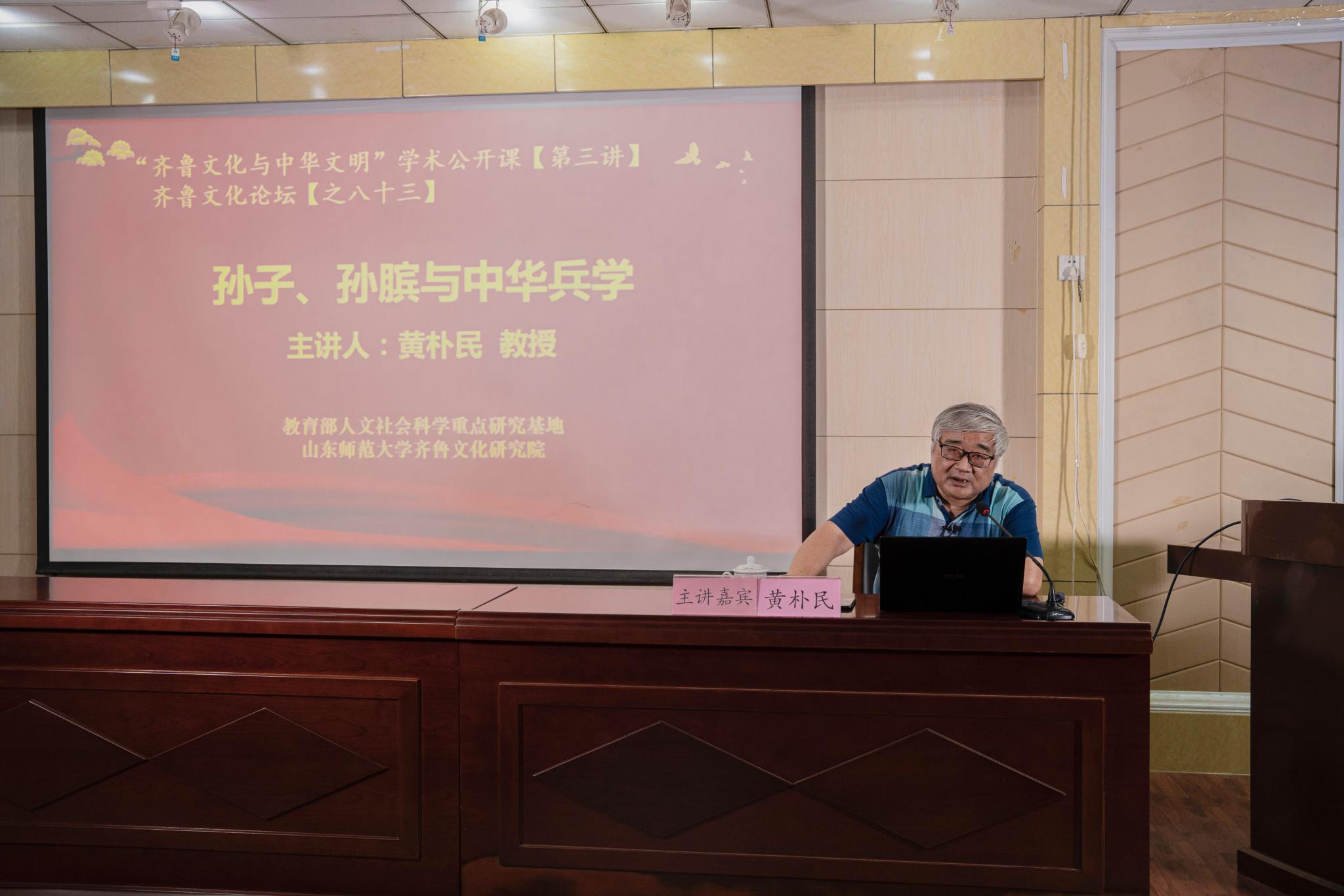 9月23日,由教育部人文社会科学重点研究基地山东师范大学齐鲁文化研究院主办的“齐鲁文化与中华文明”学术公开课第三讲,在山东师范大学千佛山校区逸夫楼报告厅举行。本次公开课邀请中国人民大学国学院博士生导师、中国孙子兵法研究会常务理事黄朴民教授担任主讲嘉宾,讲座的题目是《孙子、孙膑与中华兵学》。直属单位党委副书记、齐鲁文化研究院副院长颜春杰和研究院全体师生、学校部分本科生聆听了报告。讲座由齐鲁文化研究院副院长吕文明教授主持。