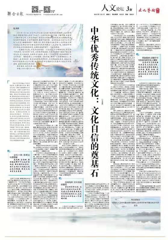 4月2日,“人文论坛”第一期刊发了省政协原副主席、山东师范大学特聘资深教授、教育部人文社科重点研究基地山东师范大学齐鲁文化研究院名誉院长王志民的理论文章《中华优秀传统文化:文化自信的奠基石》。文章指出,浑融一体的中华优秀传统文化是中国文化自信的根基,树立中华文化自信,最基础、最根本的是对中华民族五千年文明发展历程中形成的中华优秀传统文化的自信。
