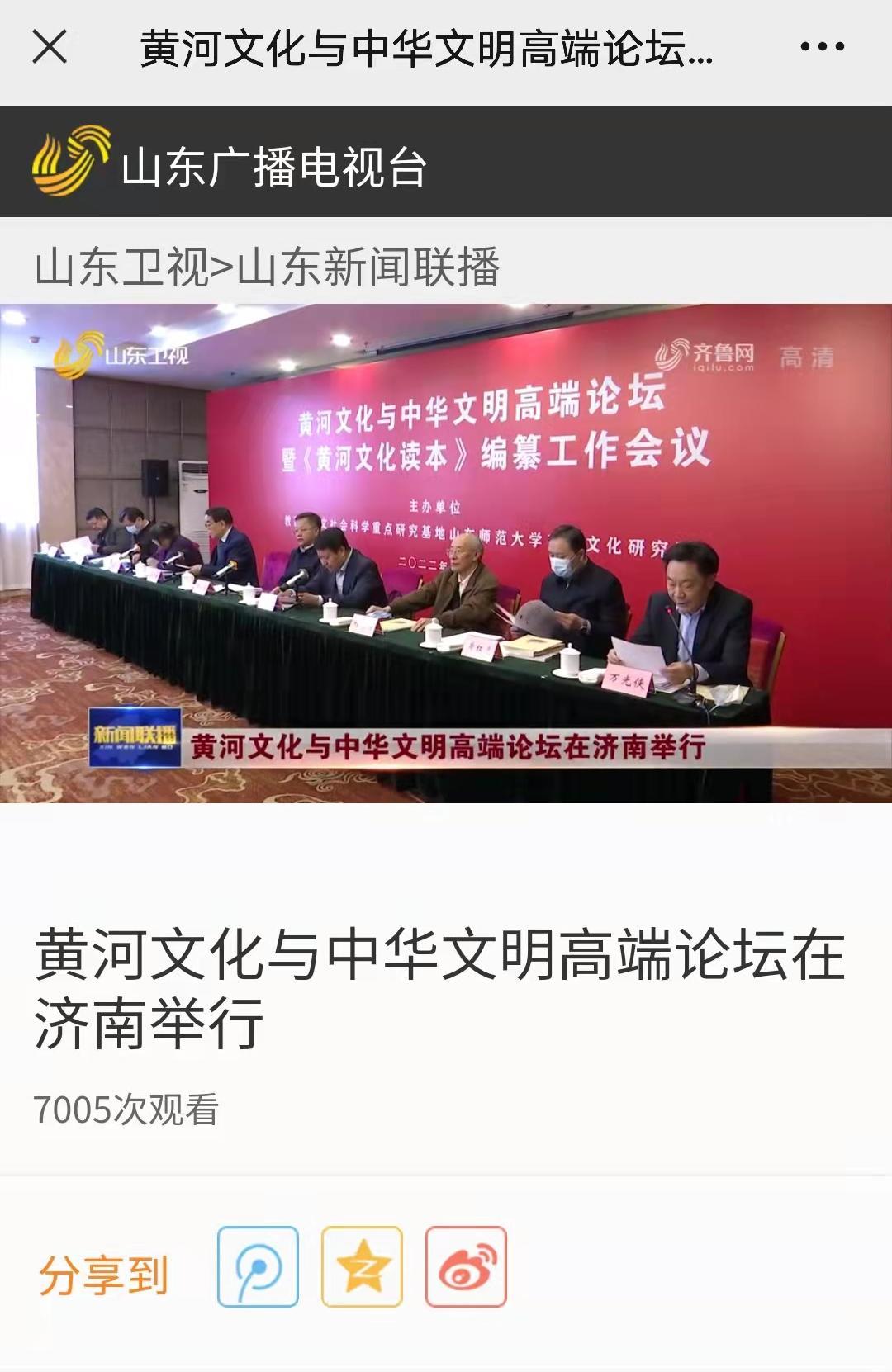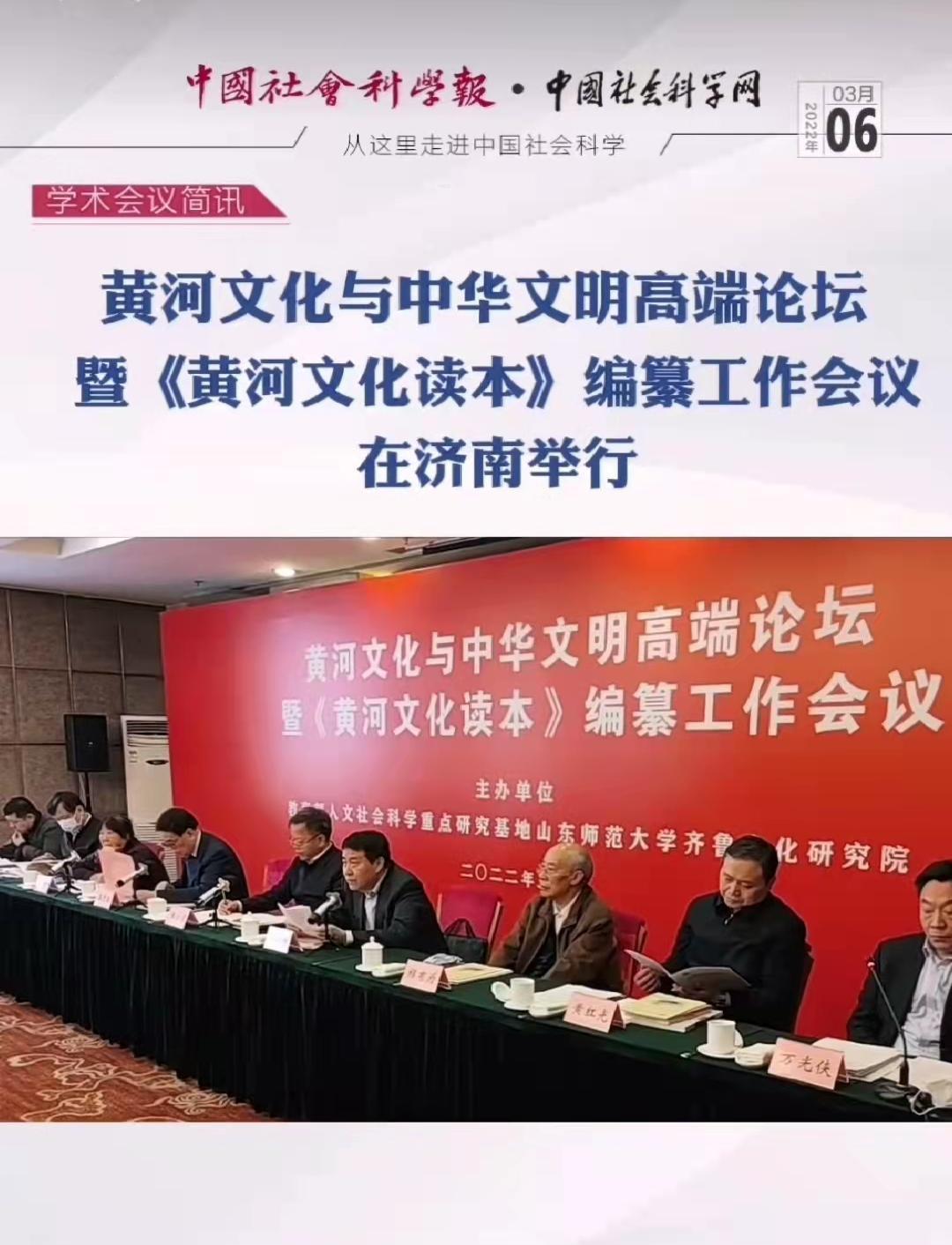 3月5日—6日,由教育部人文社科重点研究基地山东师范大学齐鲁文化研究院主办的“黄河文化与中华文明高端论坛暨《黄河文化读本》编纂工作会议”在济南举行。山东人民广播电台、中国社会科学网、新黄河等多家媒体和平台进行了报道。