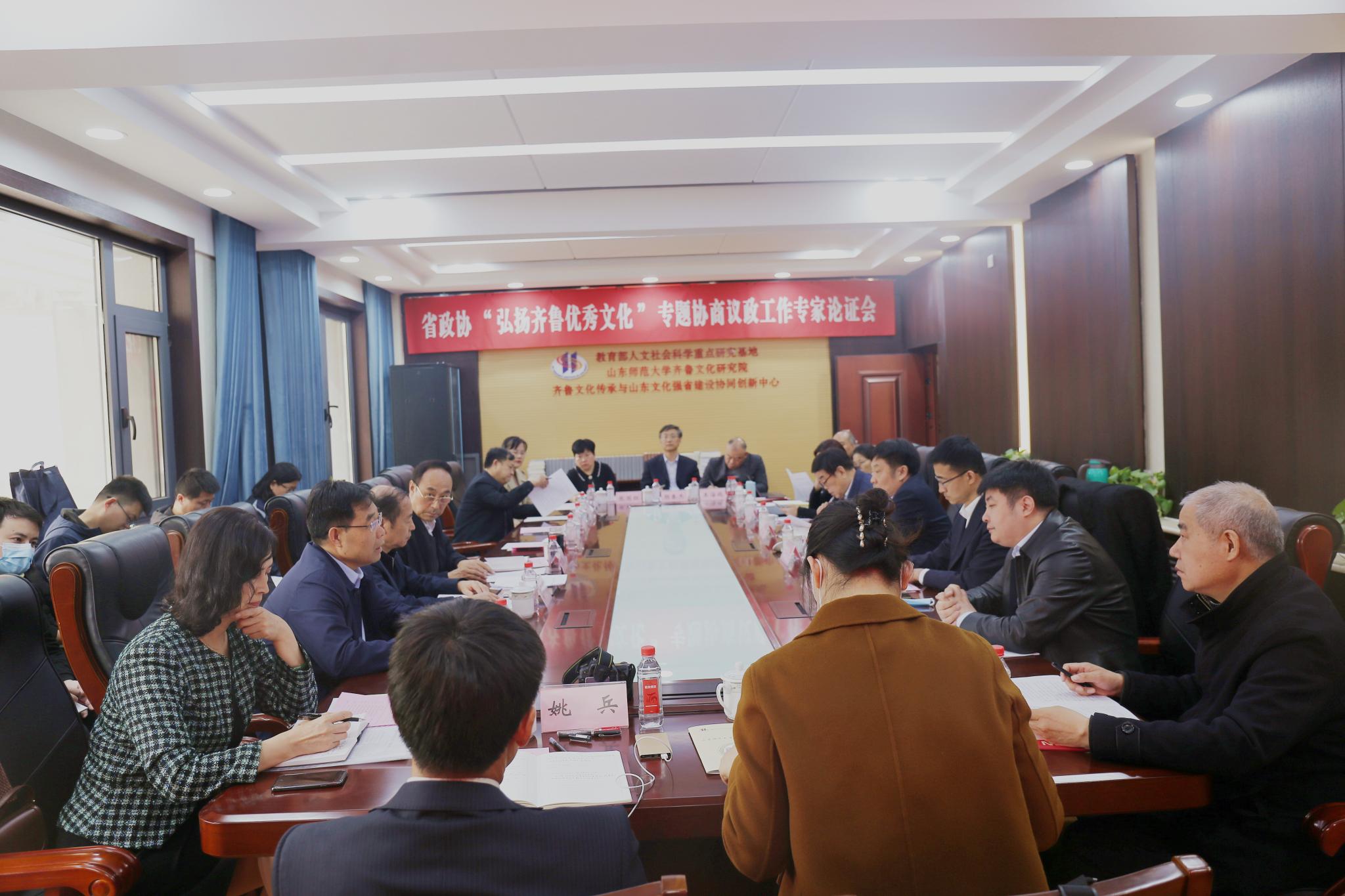4月1日上午,山东省政协“弘扬齐鲁优秀文化”专题协商议政工作专家论证会在齐鲁文化研究院召开。本次会议由山东省政协文化文史和学习委员会、教育部人文社会科学重点研究基地山东师范大学齐鲁文化研究院联合主办。省政协原副主席、齐鲁文化研究院名誉院长王志民,省政协文化文史和学习委员会主任刘凤岐,副主任高峰岗、刁仕军,山东省社科联党组书记、副主席刘致福,齐鲁师范学院副院长刘德增,大众报业集团培训委员会总监逄春阶,副校长万光侠,以及来自省政协、省社科联和山东师范大学的20余位专家学者出席了此次会议。会议由刘凤岐主持。省政协副主席、校党委书记唐洲雁和校长曾庆良分别会见了参加会议的领导和专家。